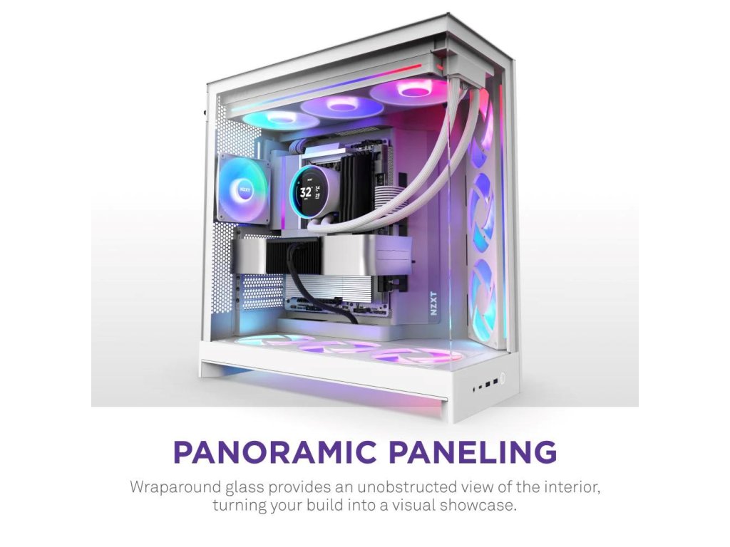 - Panoramatický výhľad: Ukážte každý detail svojej zostavy vďaka bezproblémovému obklopujúcemu panelu z tvrdeného skla.
