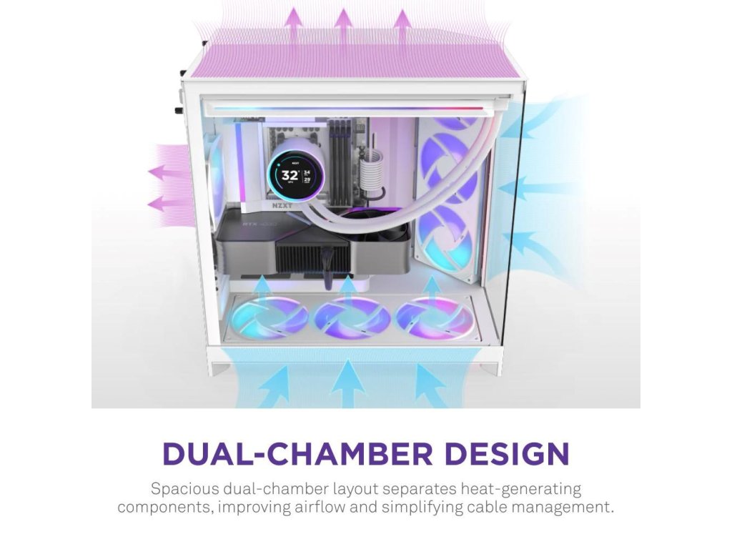 H9 Flow je priestranný stredový tower ATX skriňa určená pre vysokovýkonné zostavy, vyváženie prúdenia vzduchu a estetiky. Jej dvojkomorový dizajn zlepšuje chladenie a správu káblov, zatiaľ čo perforované panely, uhlové ventilátory a dostatočná podpora ventilátorov a chladičov poskytujú optimálny tepelný výkon.