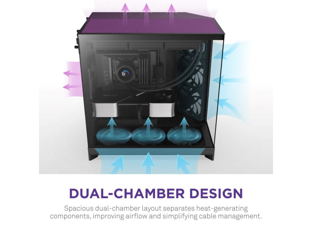 - Dvojkomorový dizajn: Oddelí hlavné komponenty od zdroja napájania a diskov, čím zlepšuje tepelný výkon a správu káblov.