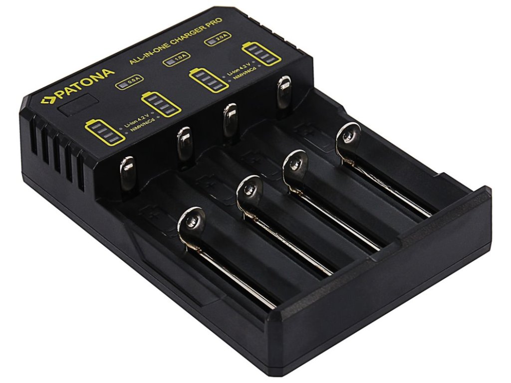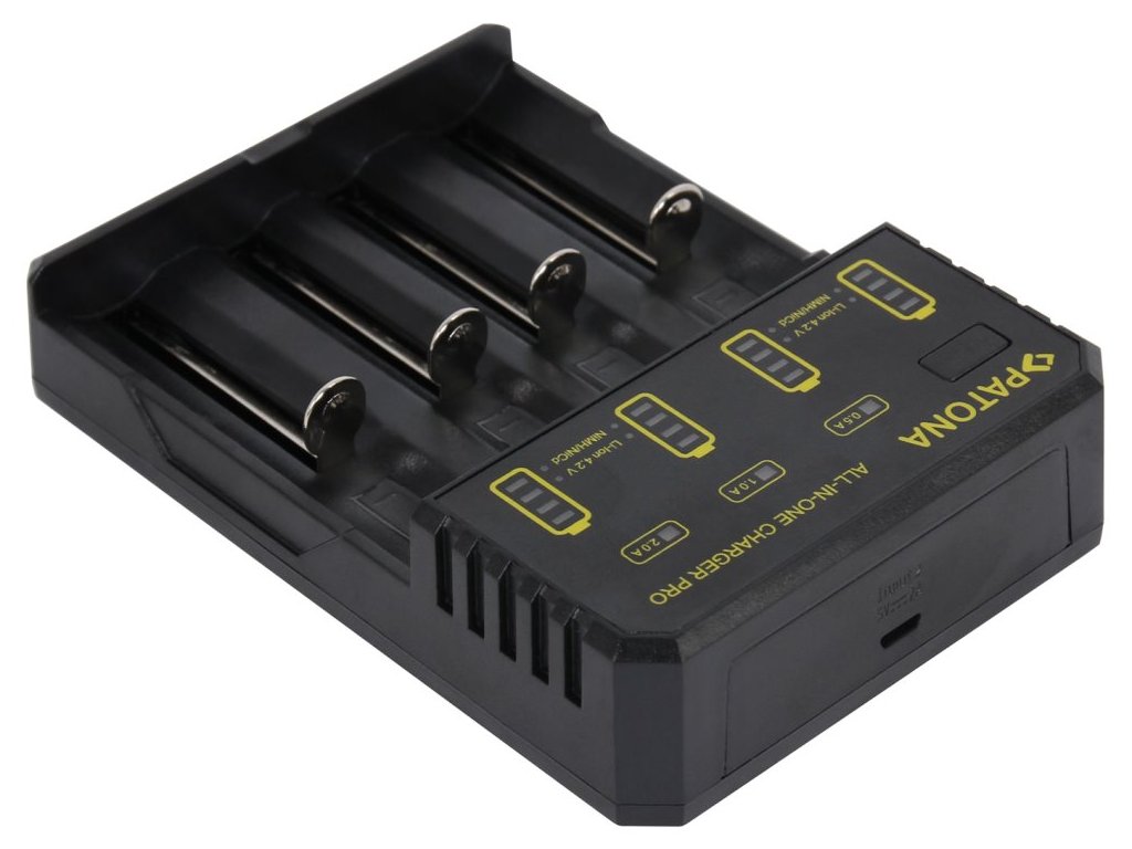 PATONA All-In-One Charger ProUniverzální nabíječka se čtyřmi sloty umožňuje nabíjet širokou škálu baterií včetně AA, AAA, CR123A či 18650. Vestavěný mikroprocesor chrání baterie před přehřátím nebo přebitím. Napájení je realizováno skrze micro USB konektor.