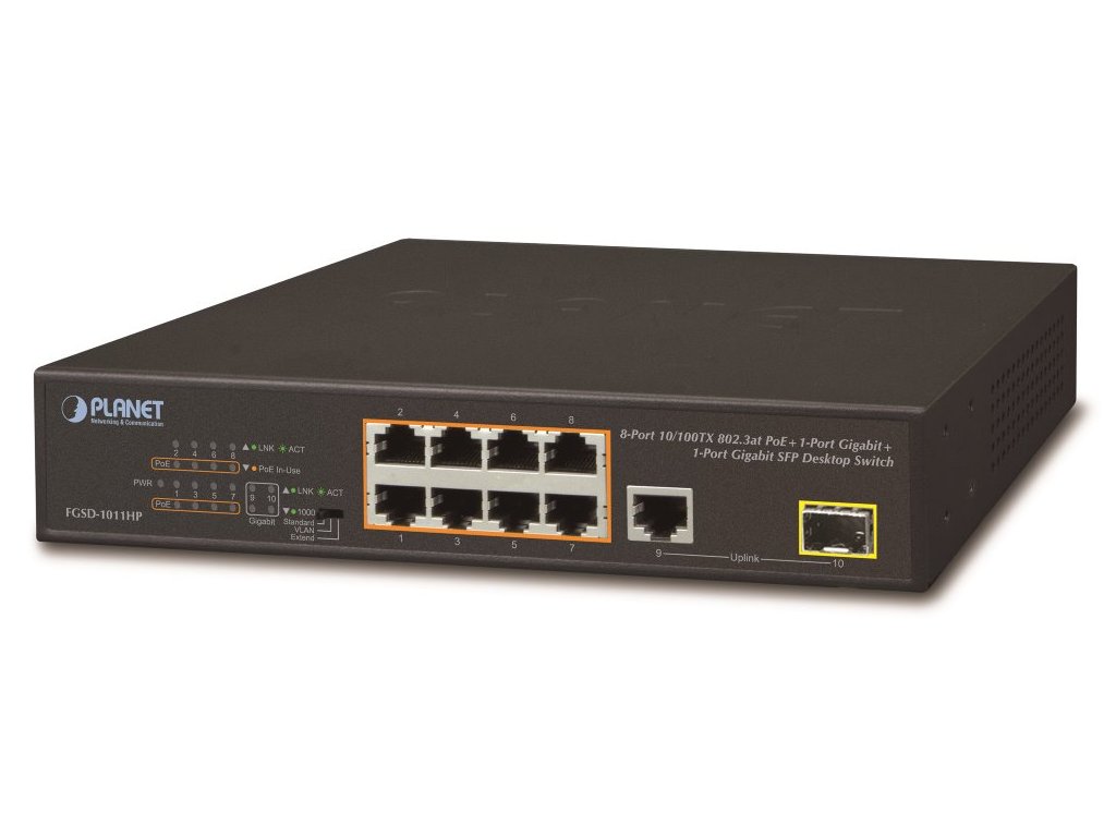 PLANET FGSD-1011HPPoE přepínač s výkonem 120 W, 8x 10/100Base-TX s možností napájení dalších IEEE 802.3at zařízení, dva uplink 1000Base-X porty 1x TP a 1x SFP.