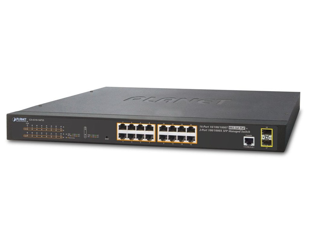 PLANET GS-4210-16P2SSpravovatelný PoE přepínač 16 portů 1000Base-T s injektory 802.3at, výkon až 220 W, 2x SFP porty 100/1000Base-X, Switching, Full Duplex (1000/2000 Mbps), Auto-Negotiation (10/100/1000 Mbps)
