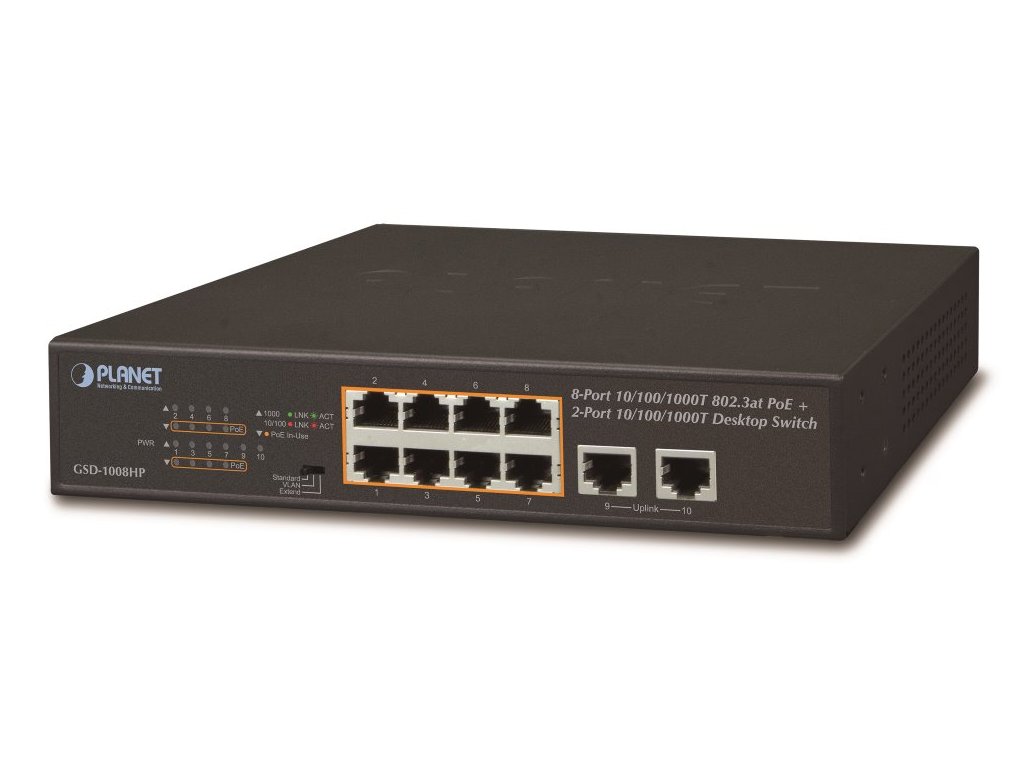 Planet GSD-1008HP, PoE switch 8x PoE 802.3at 120W+ 2x 1000Base-T, VLAN, extend mód 10Mb/s do 250m GSD-1008HP