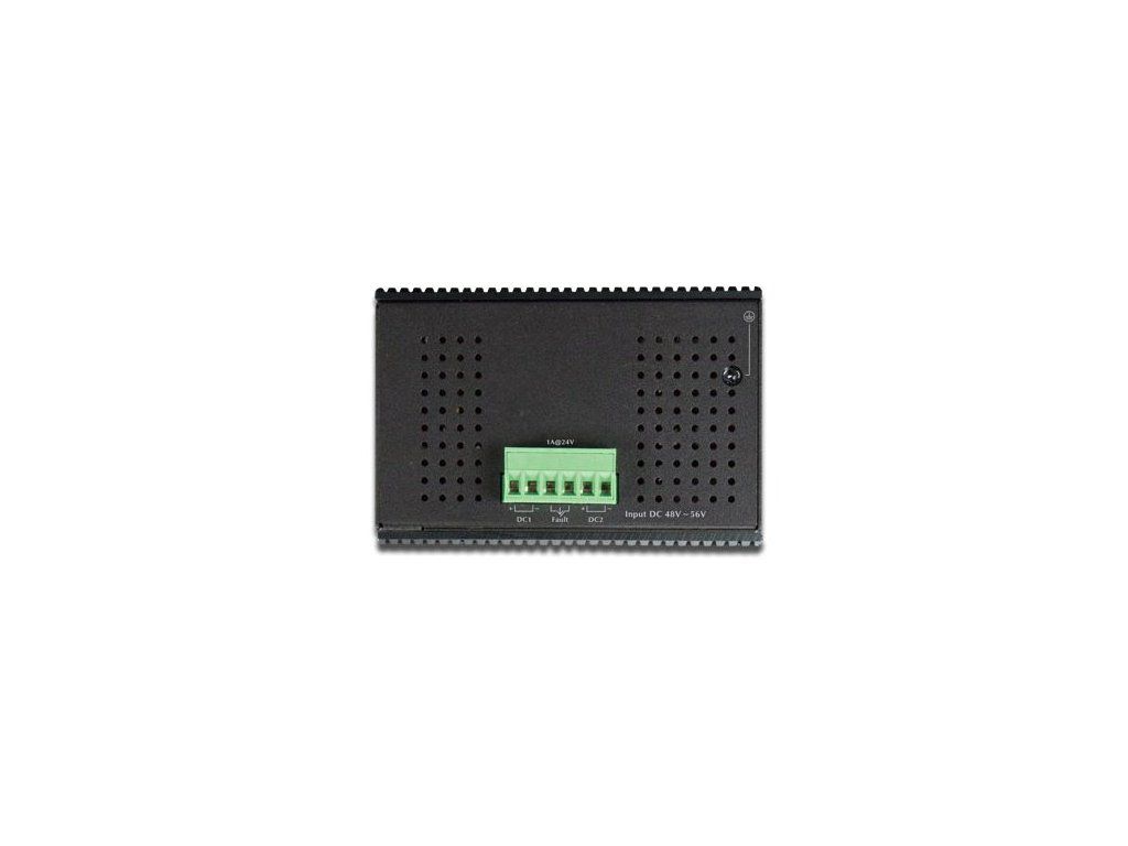 DIP přepínače pro aktivaci Extend PoE módu 10Mb/s. Možnost redundantního napájení DC 48~56V, krytí IP30, hliníková skříň, pracovní teplota -40 až +75°C.