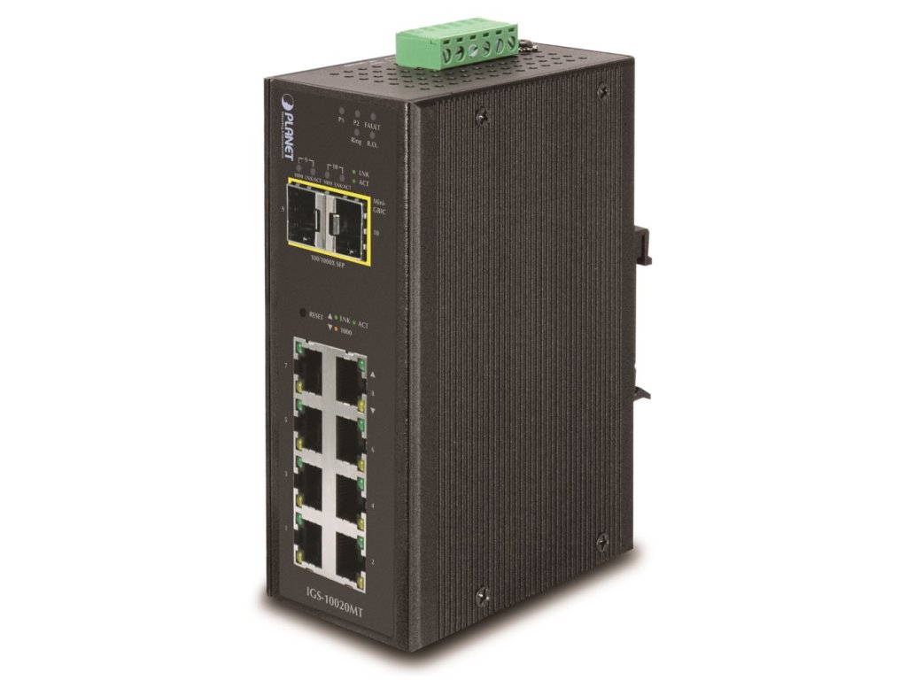 PLANET IGS-10020MTPrůmyslový spravovatelný přepínač a konvertor 8x 10/100/1000Base-T, 2x SFP 100/1000Base-X, podpora IPv6.
