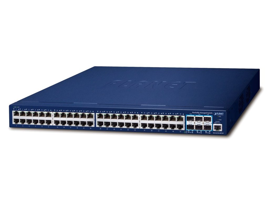 PLANET SGS-6310-48T6XStohovatelný řízený L3 switch, 48x RJ-45 10/100/1000 Base-T, 6x 10G SFP+ Base-SR/LR, 1x RJ-45 (RS-232) konzolový port.