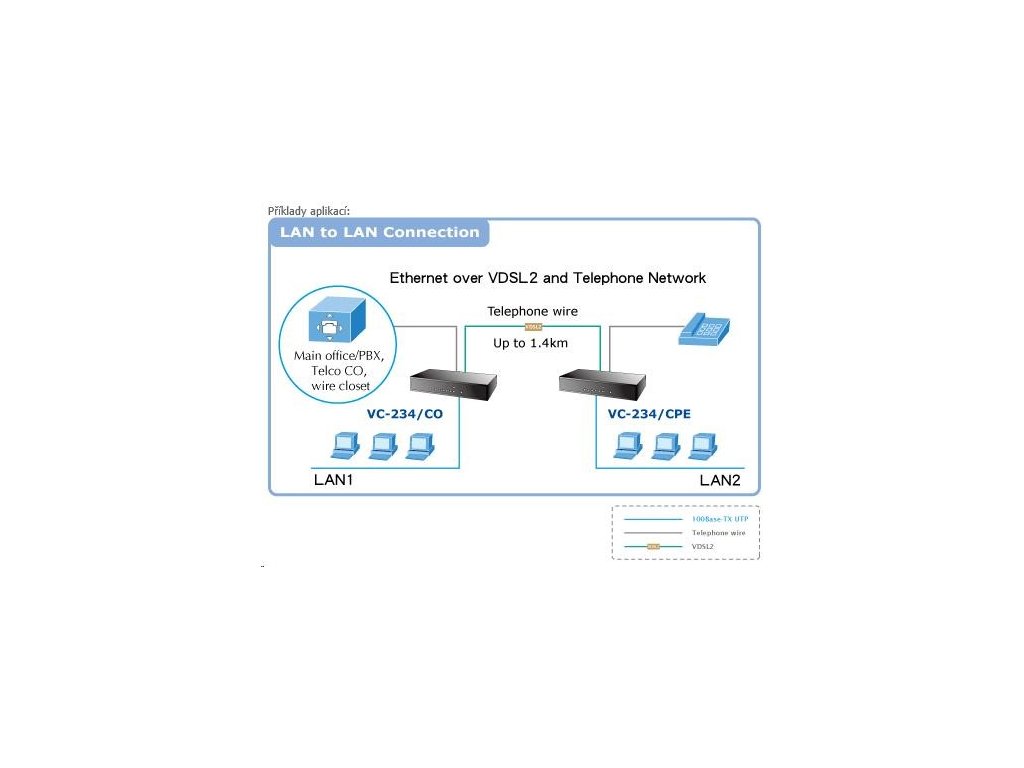 Ethernet cez telefónnu linku (technológia VDSL2). 4x LAN RJ-45, 2x RJ-11 konektor pre VDSL2 a POTS. 100/100 Mb/s na vzdialenosť 300 m.Priehľadný most. Dosah až 1,4 km. Nastavenie prepínača DIP. Voliteľný Master (CO) / Slave (CPE). Zabudovaný rozdeľovač. Výkonný konvertor LRE (Long Reach Ethernet) Ethernet na VDSL2 (Very-high-data-rate Digital Subscriber Line 2) umožňuje prenášať dáta cez symetrický pár vodičov rýchlosťou až 100 Mb/s na vzdialenosť 300 m alebo 20/4 Mb/s na vzdialenosť až 1,4 km. Integrovaný rozdeľovač zachováva hlasovú službu na telefónnej linke bez ďalších úprav zapojenia, dátová prevádzka sa jednoducho pridá k existujúcej hlasovej prevádzke. Je teda možné používať telefónne káblové vedenia pôvodne určené nielen na pripojenie k účastníkom, ale aj medzi analógovými ústredňami. ISP (poskytovateľ internetových služieb) tak môže ponúkať multimediálne služby, VOD (video na požiadanie), VoIP (hlas cez IP), videotelefón, IPTV atď. Zariadenie je univerzálne ako jednotka master (CO) / slave (CPE), režim sa nastavuje prepínačom. Jednotka podporuje prevádzkové režimy VDSL2 "17a" a "30a", ako aj "band Plan997", ktoré ovplyvňujú symetrický prenos dát pri vyšších rýchlostiach. Vlastnosti: - 2x RJ-11 port pre VDSL a POTS (Plain Old Telephone Service) - 4x LAN 10/100Base-TX, prepínanie, plný duplex (100/200 Mbps), automatické vyjednávanie (10/100 Mbps) - transparentný pre IEEE 802.1Q VLAN tag - parametre nastavené prepínačmi DIP na zariadení: výber CPE/CO, výber modulácie, výber komunikačného limitu, výber SNR - podpora štandardov: IEEE 802.3, 10Base-T, IEEE 802.3u, 100Base-TX, IEEE 802.3x - spĺňa štandardy VDSL ITU-T G.993.1, ITU-T G.997.1, ITU-T G.993.2 - Rozmery: 155 x 86 x 26 mm - Hmotnosť: 368 g - Externé napájanie 5V/2A - Prevádzková teplota: 0 až 50 °C Rozsah a rýchlosti na vedeniach s vodičmi AWG24 a lepšími: > profil 17a (Downstream / Upstream) - 200m -> 99/70Mbps - 400m -> 99/60Mbps - 600m -> 90/45Mbps - 800m -> 50/28Mbps - 1000m -> 40/12Mbps - 1200m -> 20/7Mbps - 1400m -> 20/4Mbps > profil 30a (Downstream / Upstream) - 300m -> 100/100Mbps - 400m -> 90/90Mbps - 600m -> 69/55Mbps - 800m -> 48/9Mbps.Dodatočné parametre