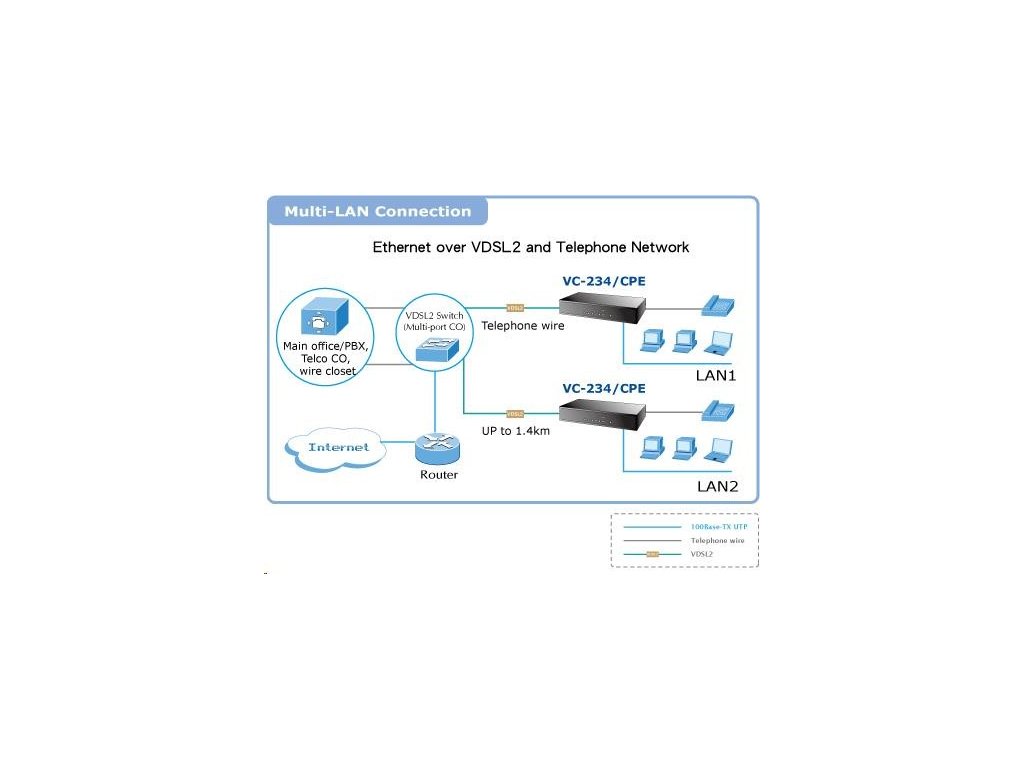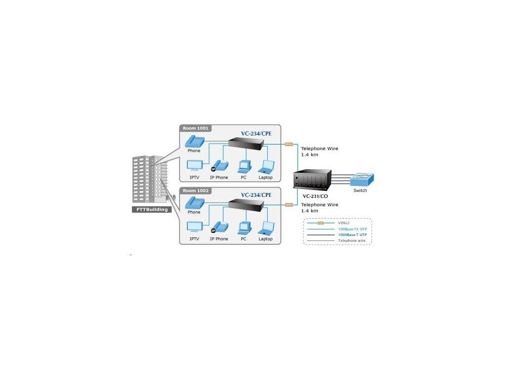 Planet VC-234, Eth. VDSL2 konvertor, 100Mbit, master/slave, 2x RJ-11, splitter, 4x RJ-45 VC-234