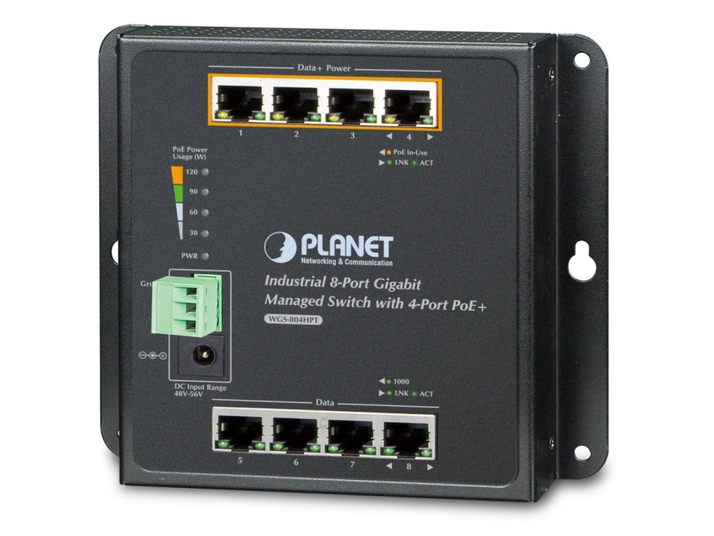 PLANET WGS-804HPTSpravovatelný gigabitový přepínač 8 portů 1000Base-T, 4 porty s PoE injektorem 802.3at, celkový výkon až 120W.