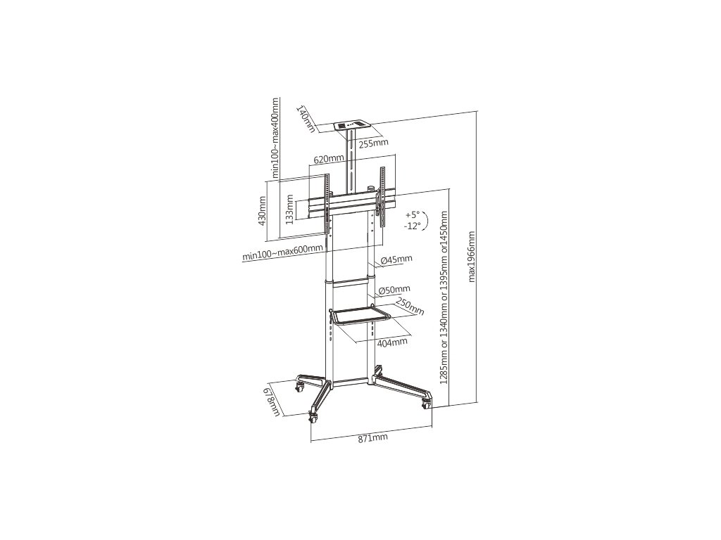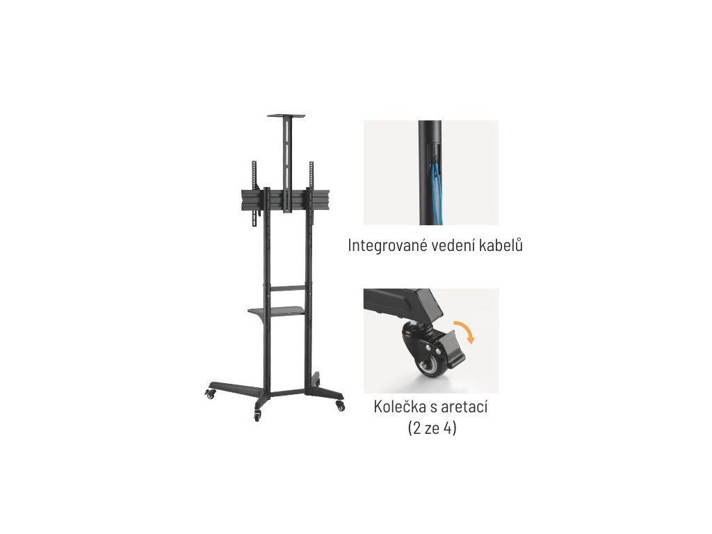 Všestranný pojízdný stojan Brateck T1040T je určen pro instalaci TV s plochou obrazovkou s úhlopříčkami od 37“ do 70“ a hmotností až 50 kg. Stojan poskytuje stabilní podporu a díky integrovaným kolečkům s možností aretace zároveň umožňuje snadné a bezpečné přemístění dle potřeby. Montážní deska pro upevnění TV je nastavitelná ve čtyřech různých výškových úrovních, jednoduchá změna náklonu TV v rozsahu +5°~-12° pak umožňuje nastavení optimálního pozorovacího úhlu. Stojan je navíc vybaven jednou výškově stavitelnou poličkou na kameru s nosností 5 kg a jednou výškově nastavitelnou poličkou na příslušenství s nosností 5 kg. Díky tomuto příslušenství je stojan vhodný pro pořádání telekonferencí, ale také pro využití při kancelářských a školních prezentacích, nebo při domácí zábavě. Hlavní vlastnosti: • Montáží deska pro upevnění TV je nastavitelná ve čtyřech výškových úrovních – 1285, 1340, 1395 nebo 1450 mm • Výškově nastavitelná police s nosností až 5 kg poskytuje dostatek úložného prostoru pro příslušenství • Výškově nastavitelná police s nosností až 5 kg na kameru • Jednoduchá změna náklonu TV v rozsahu +5°~-12° bez použití nástrojů • 4 kolečka umožňují snadné a bezpečné přemístění stojanu dle potřeby, 2 kolečka s možností aretace • Vnitřní vedení kabelů rámem stojanu pro jejich snadnou organizaci a uspořádání • Podporované rozteče VESA: 100x100,200x100,200x200,300x200,400x200,300x300,400x300,400x400,600x400 • Jednoduchá a rychlá montáž Parametry: • Určeno pro zařízení: TV • Způsob montáže: samostatně stojící • Počet TV: 1 • Rozsah výškového nastavení: 1285, 1340, 1395 nebo 1450 mm • Maximální náklon (nahoru, dolů): +5°~-12° • Maximální vychýlení (vpravo, vlevo): 0° • Maximální otáčení obrazovky: 0° • Maximální hmotnost TV: 50 kg • Minimální rozměr TV: 37'' • Maximální rozměr TV: 70'' • Barva: černá mat • Rozměry (Š x V x H): 871mm x 678mm x 1966mm • Hmotnost: 12.2 kgDodatočné parametre