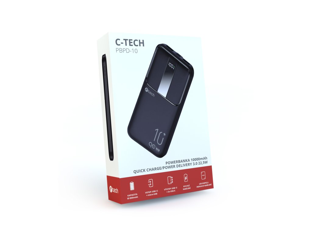 Představujeme vám novou powerbanku C-tech PBPD-10 s kapacitou 10000mAh, která v sobě spojuje výkon, rychlost a elegantní design. Tato powerbanka využívá pokročilé Li-pol články, což zajišťuje spolehlivý a dlouhotrvající zdroj energie pro vaše mobilní zařízení. Jedním z klíčových prvků této powerbanky je schopnost obousměrného rychlého nabíjení. Díky podpoře protokolů rychlého nabíjení Power Delivery a Quick Charge 3.0 můžete rychle dobíjet nejen svou powerbanku, ale i vaše připojené zařízení. S vstupy USB C a micro USB je nabíjení snadné a flexibilní. Pro dosažení optimálního výkonu je třeba použít externí zdroj s minimálně 18W (není součástí balení) připojený k USB-C nebo micro USB konektoru. Powerbanka dosáhne 80% kapacity za méně než 2 hodiny a na plnou kapacitu je potřeba pouze 3 hodiny. Při nabíjení vašich zařízení oceníte možnost výběru mezi USB-C a USB A výstupy, což umožní současné nabíjení více zařízení. S informativním displejem budete mít stále přehled o zbývající kapacitě baterie popř. stavu nabíjení. Zelená ikonka zase indikuje rychle dobíjení/nabíjení. Měkký gumový povrch poskytuje příjemný pocit při dotyku a zároveň chrání powerbanku před otisky prstů a poškrábáním. S touto novou powerbankou od C-tech získáte spolehlivý a výkonný zdroj energie pro vaše mobilní zařízení, který splňuje nejvyšší standardy kvality a designu. Nechte se přesvědčit o výjimečnosti této powerbanky, která bude spolehlivým parťákem ve vašem každodenním životě. Specifikace : Kapacita baterie : 10000mAh (3,7V), 37Wh, 10Ah Typ baterie : Li-Pol (Lithium-polymer) Obousměrné rychlé nabíjení Quick Charge/Power Delivery 3.0 LED display s indikací nabíjení Vstup : USB-C 5V/2,6A 9V/2A 12V/1,5A micro USB 5V/2A 9V/2A 12V/1,5A Výstup : USB-C 5V/3A 9V/2,22A 12V/1,67A USB-A 5V/3A 9V/2A 12V/1,5A 5V/4,5A Ochrana proti zkratu Přepěťová ochrana Rozměry : 136x68x13mm Váha : 225g Obsah balení : powerbanka, kabel USB-C, kabel USB-A/USB-C, manuálDodatočné parametre