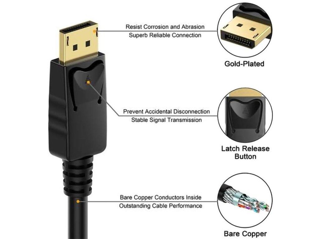 PremiumCord DisplayPort 1.4 prípojný kábel M/M, pozlátené konektory, 5m DisplayPort 1.4 zvyšuje maximálnu dátovú rýchlosť o 50% oproti rýchlostiam dátového prenosu DisplayPort 1.2 1. kábel (HBR1): 810 MB/s (6.48 Gb/s): pre rozlíšenie 2560 x 1600 2. kábel (HBR2): 1620 MB / s; pre rozlíšenie 3840 x 2160 3. kábel (HBR3): 3240 MB/s (25,92 Gb/s): pre rozlíšenie 5120 x 2880 - Maximálne rozlíšenie: - 8K (7680x4320) pri 60Hz a 24 bitová farebná hĺbka - 5K (5120x2880) pri 60Hz a 30 bitová farebná hĺbka - 4K (3840×2160) pri 120Hz a 24 bitová farebná hĺbka - Supports HDCP 2.2 - DisplayPort 1.4 - Maximálny dátový prenos: 32,4 Gb/s - Podporovaná farebná hĺbka: (30 Bit), True Color (24 Bit) - Konektory: DisplayPort (20pin) male <=> DisplayPort (20pin) male - 20-vodičový kábel, dvojité tienenie, medený vodič prierezu AWG25 - Pozlátené konektory - Konektory obsahujú poistku proti vytiahnutiu konektora - Farba čierna - Balenie v PVC sáčku s EAN kódom a popisom - Dĺžka kábla: 5 mDodatočné parametre