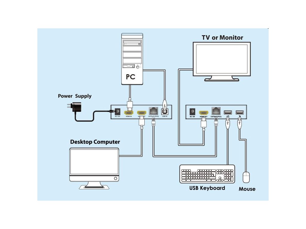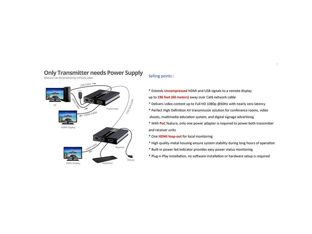 PremiumCord HDMI KVM extender s USB na 60m cez jeden kábel Cat5/6, bez oneskorenia Zariadenie umožňuje po jednom sieťovom kábli bez oneskorenia preniesť HDMI FULL HD 1080p signál a USB až na vzdialenosť 60m. - KVM extender (keyboard, video and mouse) umožňuje preniesť spoločne signál na väčšiu vzdialenosť a vzdialene ovládať počítač alebo server. - Podporuje FULL HD 1080p až na 60m pri použití kvalitného UTP kábla CAT6 s medenými vodičmi AWG23 (odporúčame náš kábel kód: sutpd6c3) - Odporúčame pre prepojenie kvalitný UTP kábel Cat5e, Cat6, Cat7 s medenými vodičmi, najlepšie AWG23, nemusí byť tienený - Pre rozlíšenie: 720x576 @ 50Hz, 720x480 @ 60Hz, 1280x720 @ 60Hz, 1920x1080 @ 60Hz, 640x480 @ 60Hz, 800x600 @ 60Hz, 1024x760 @ 60Hz 60Hz, 1440x900@60Hz, 1680x1050@60Hz - Prenosový dátový tok: 10.2Gbps - Kompatibilný s HDMI 1.3 - Podporuje HDCP1.4 - Maximálny dosah: 60m pri použití CAT6 kábla AWG23 - Maximálny dosah: 50m pri použití CAT5 kábla AWG24 - Vstupný HDMI kábel max. 8m pri použití HDMI kábla s vodičmi AWG24 - výstupný HDMI kábel max. 8m pri použití HDMI kábla s vodičmi AWG24 - Vysielač a prijímač sa navzájom prepojí kvalitným CAT6/CAT5e káblom.Obe jednotky majú prepojovací konektor RJ45 - Vysielač má jeden vstupný HDMI konektor a jeden lokálny HDMI výstup. Prijímač má jeden HDMI výstup pre vzdialená monitor. - Extender prenáša aj USB, vysielač má jeden USB pre zapojenie do počítača, prijímač má dva USB konektory pre zapojenie napríklad myši a klávesnice - Vysielač a prijímač sú napájané z priložených napájacích adaptérov 230V/5V, 2A, tento extender umožňuje napájanie len z jednej strany jedným adaptérom, ako je uvedené na priloženom obrázku - Rozmery vysielača: dĺžka: 91mm, šírka: 79mm, výška: 18mm - Rozmery prijímača: dĺžka: 91mm, šírka: 79mm, výška: 18mm - váha: 210g + 210g - Pracovná teplota: 0-60°C V balení: 1x Jednotka vysielača 1x Jednotka prijímača 1x manuál 1x napájací adaptér 5V/2ABuďte prvý, kto napíše príspevok k tejto položke.