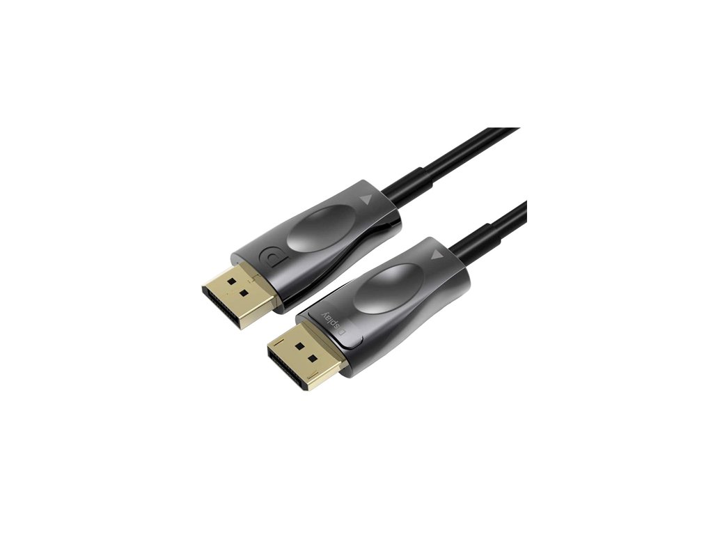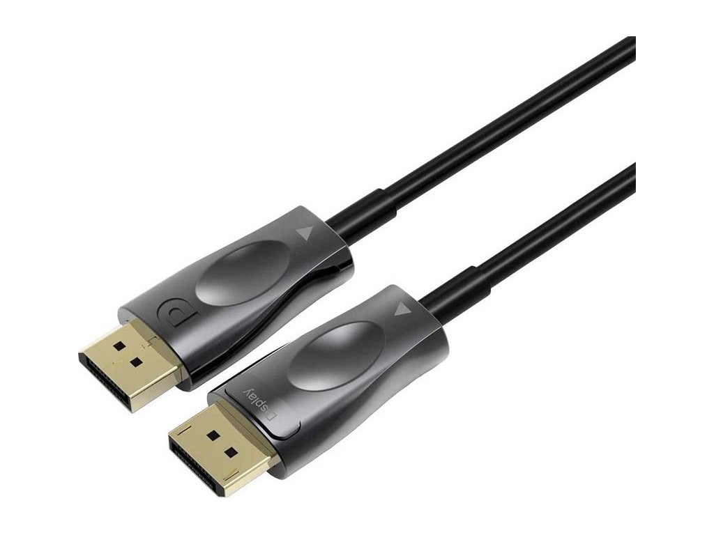 PremiumCord Optický DisplayPort 1.4 prípojný kábel M/M, pozlátené konekt. 15m Optický DisplayPort kábel slúži na spojenie dvoch audio/video zariadení cez moderné DisplayPort rozhranie, ako je napr. HD-DVD/BluRay prehrávač a LCD/Plazma televízor prenáša digitálny zvuk aj obraz a podporuje digitáciu ochranu obsahu HDCP. - Maximálne rozlíšenie: - FULL HD 1080p (1920x1080) pri 120Hz - 4K Ultra HD 2160p (3840×2160) pri 120Hz - 5K Ultra HD 2880p (5120x2880) pri 60Hz - 8K Ultra HD 4320p (7680x4320) pri 30Hz - Podporuje DisplayPort 1.4 štandard - Maximálny dátový prenos: 32.4 Gb/s - Pozlátené konektory: DisplayPort male <=> DisplayPort male - Podporuje HDCP2.2 - Kompletné napájanie so zbernicou DisplayPort, nepotrebuje externé napájanie - Okrúhly optický kábel (vnútorná štruktúra: optický kábel + metalické vodiče) - Hrúbka optického kábla 4.6mm - Ohybný optický kábel pre malý polomer ohybu (20 mm) - Optické vlákno: OM3 Multimode Fibre Optic - Pozlátené konektory - Konektory obsahujú poistku proti vytiahnutiu konektora - Farba kábla: čierna - Maximálna pracovná teplota: 50°C - Balenie v PVC sáčku s EAN kódom a popisom - Dĺžka kábla: 15 m Kábel obsahuje aktívnu elektroniku, ktorá funguje iba v jednom smere signálu. Kábel sa musí vždy zapojiť pri vypnutých zariadeniach a to iba v smere vyznačenom na kábli. Konektor označený "Source" sa vždy zapája do vysielacieho zariadenia (DVD, Blueray). Konektor označený "Display" sa vždy zapája do zobrazovacieho zariadenia (LCD, televízia, projektor).Dodatočné parametre