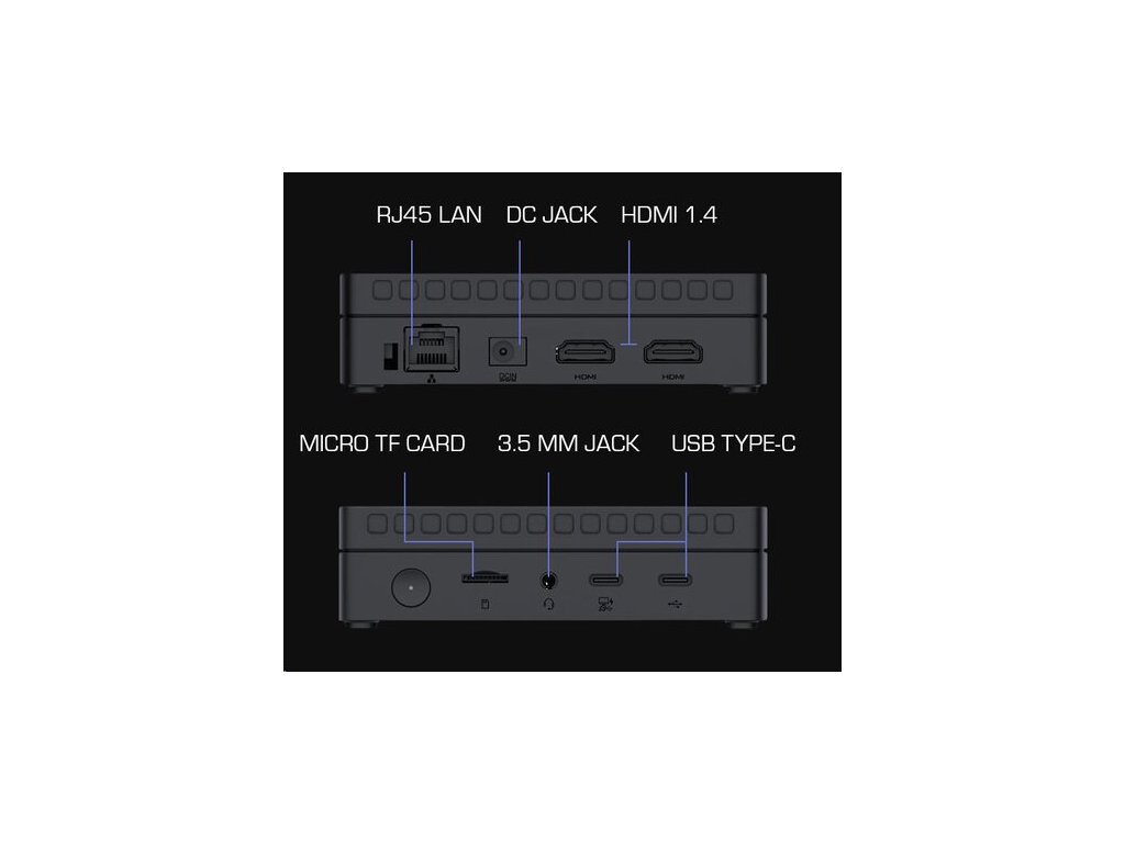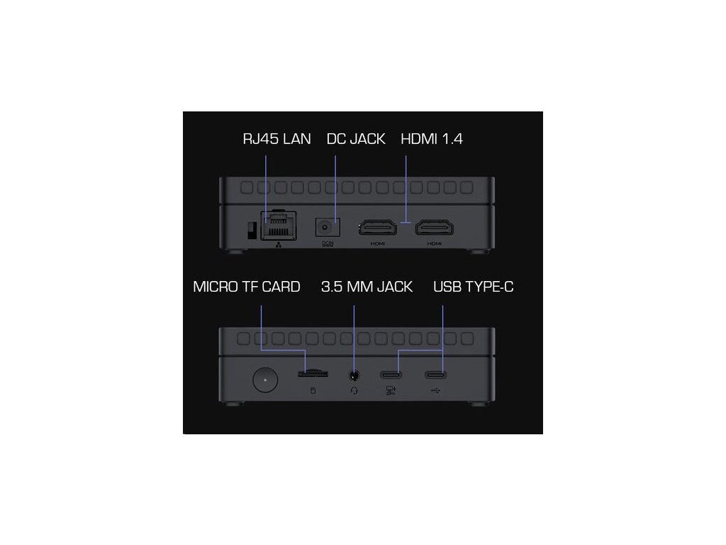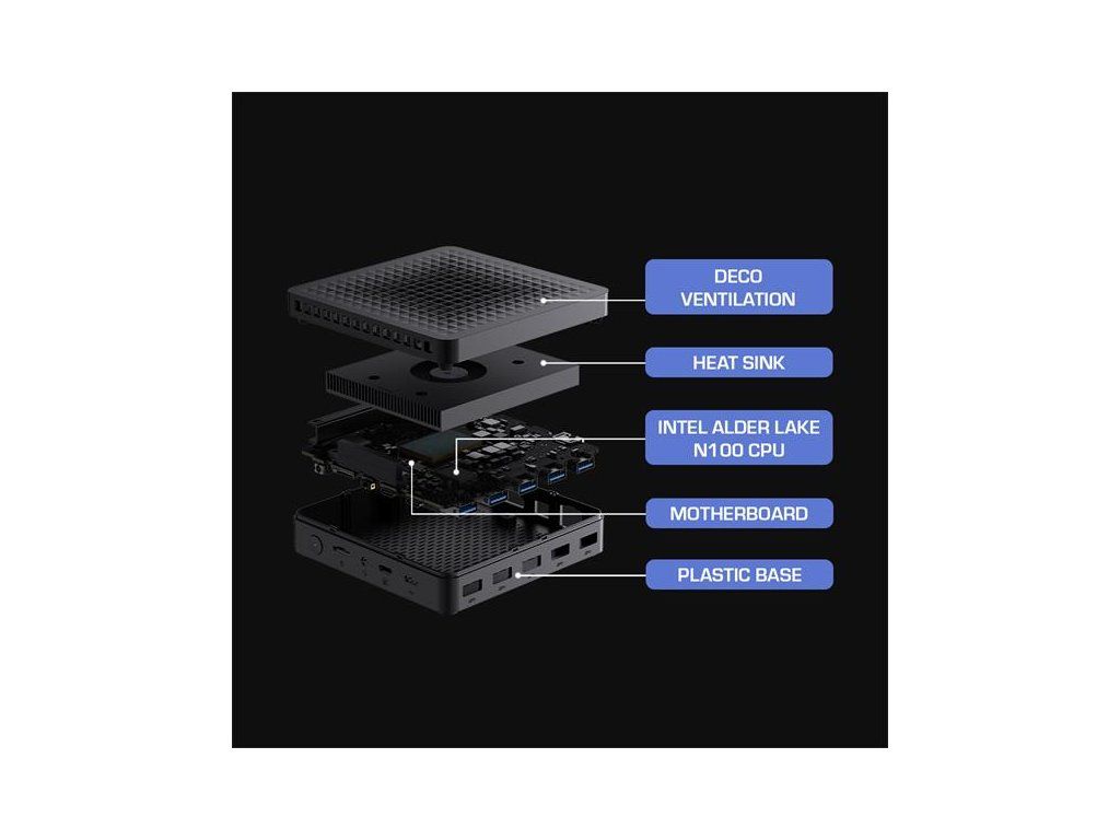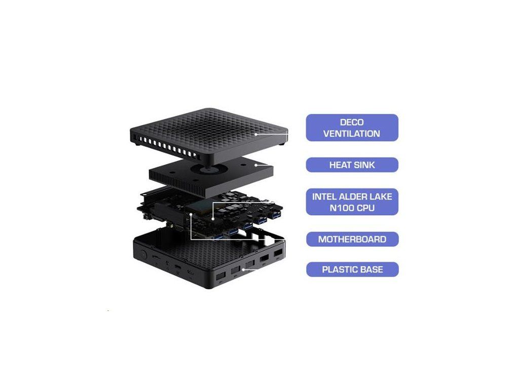 Technické špecifikácie. Napájanie: vstup 19,0 V (DC), 2,26 A, max. 43,0 W (pohotovostný režim ? 0,5 W); výstup USB (A) 5,0 V (DC), 1,0 A; výstup USB (C) 5,0 V (DC), 3,0 A. Napájací adaptér: vstup 100-240 V (AC), 0,8 A, 50/60 Hz; výstup 19,0 V (DC), 3,42 A, 65,0 W. Konektory: HDMI OUT (×2); LAN (×1); Combo Jack 3,5 mm (×1); USB (A) 3.2 (×5); USB (C) 2.0 (×1); USB (C) 3.2 (×1); slot na kartu TF/microSD (×1). CPU: Intel N100 3,4 GHz (4 jadrá). GPU: Intel UHD Graphics Xe 750 MHz. Zvukový kodek: Realtek ALC269-VC3. Operačná pamäť: DDR4, 8 GB (max. 16 GB), 3200 MHz. Interné úložisko: SSD, 256 GB (max. 2 TB). Podpora kariet TF/microSD (max. 512 MB). LAN 10/100/1000 Mbps. Wi-Fi 2,4/5 GHz; ? 19,5 dBm (79,43 mW). BT 5.2; ? 10,0 dBm (10,0 mW). Chladenie: pasívne (chladič). Ovládanie: klávesnica a myš.