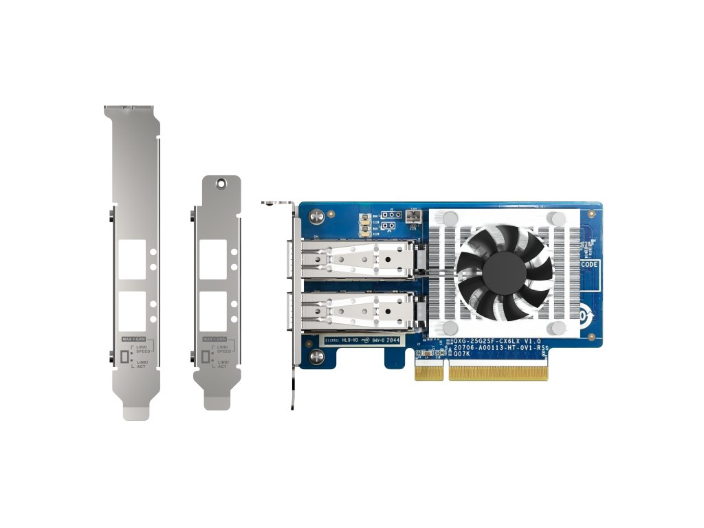 Síťová rozšiřující karta se dvěma porty 25 GbE. QXG-25G2SF-CX6 je vybavena řadičem SmartNIC NVIDIA Mellanox ConnectX®-6 Lx, podporuje PCIe Gen4 (zpětně kompatibilní s Gen3 / Gen2) a poskytuje přenosové rychlosti až 25 Gbps. Pomocí funkce Trunking portů ke kombinaci více portů lze dosáhnout až 50 GbE pro zrychlení sdílení souborů a intenzivní přenos dat. Díky podpoře SR-IOV QXG-25G2SF-CX6 výrazně zvyšuje efektivitu sítě a je ideální pro I/O náročné a na latenci citlivé virtualizační aplikace a datová centra. Technické parametry *Řadič: NVIDIA Mellanox ConnectX-6 Lx *Konektor: SFP28 *PCIe rozhraní: PCIe Gen4 x8 (zpětně kompatibilní s Gen3 a Gen2) *Přenosové rychlosti: 25 Gbps / 10 Gbps *Podporované operační systémy: QTS / QuTS Hero (doporučujeme použít poslední verze), Windows (je vyžadován ovladač), Linux (je vyžadován ovladač) *Podporované QNAP NAS: Modely s alespoň jedním volným slotem PCIe *Držák: Předinstalovaný držák s nízkým profilem, držáky plné a specializované (pro vybrané QNAP NAS) jsou dodávány *Port a kabel: Kabel SFP28 DAC (1,5 M) nebo SFP28 OPTIC Transceiver *Podporuje 25G SerDes (NRZ)Dodatočné parametre