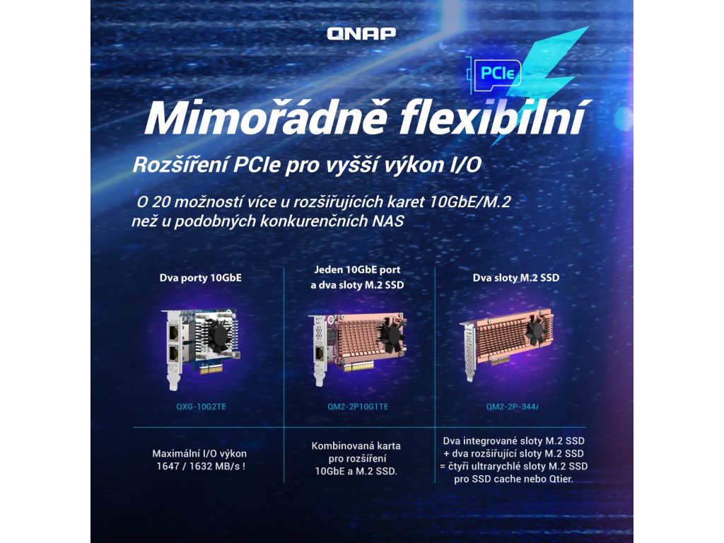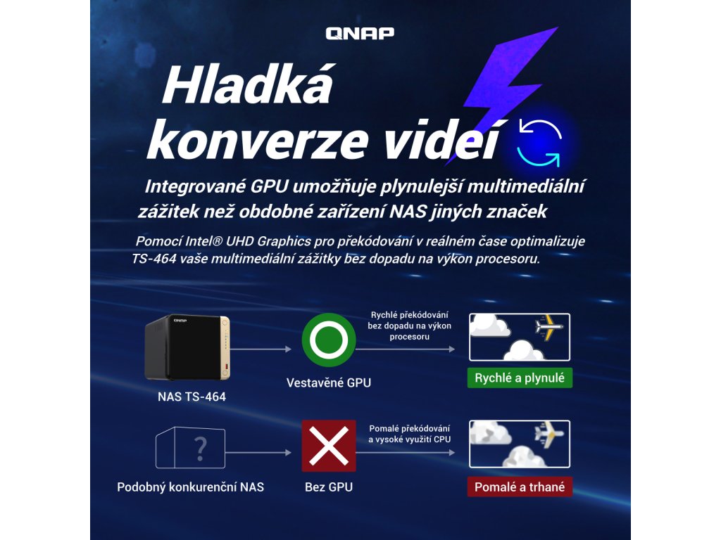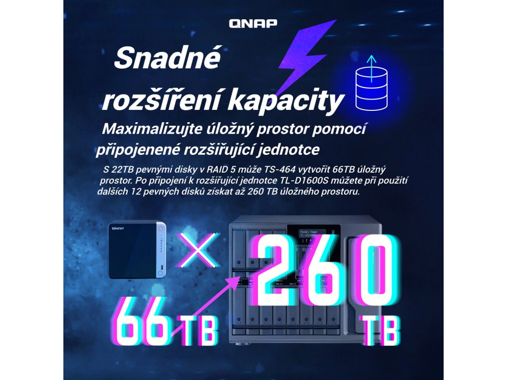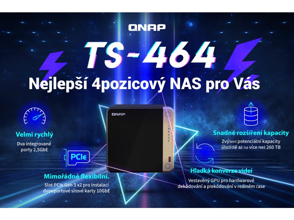 TS-464-8G Čtyřjádrový dvouportový 2,5GbE NAS s Intel procesorem nabízí využití M.2 SSD cache a rozšiřitelnost PCIe pro vysokorychlostní přenos a virtualizační aplikace Odkaz na web výrobce: https://www.qnap.com/cs-cz/product/ts-464 Seznam kompatibility pro tento model: https://www.qnap.com/cs-cz/compatibility/?model=636&category=1 Srovnání TS-464 s konkurenčním NAS: https://qnap.to/4qauc7 YT video recenze: https://www.youtube.com/watch?v=9Yer3hVe2HQ Malý NAS server, velký výkon (YT video): https://www.youtube.com/watch?v=AAj1dj-kjhA Odkaz na Evropské ocenění 2024 https://www.eha.digital/2024/06/03/10th-annual-eha-awards-winners-announced/ Článek: https://pctuning.cz/article/qnap-ts-464-rychly-nas-s-virtualizaci-a-hdmi-vystupem Funkce Zařízení TS-464 je vybaveno čtyřjádrovým procesorem Intel® Celeron® N5095 (s navýšením až na 2,9GHz), dvěma porty RJ45 2,5GbE a funkcí Slučování portů pro kombinovanou šířku pásma až 5Gb/s. Díky slotům M.2 PCIe Gen3 a PCIe Gen 3 poskytuje zařízení TS-464 flexibilitu při rozšiřování funkcí NAS a umožňuje instalovat kartu QM2 pro M.2 SSD cache nebo Edge TPU pro rozpoznávání obrázků na bázi umělé inteligence a různé síťové karty 10GbE/5GbE. Zařízení TS-464 má 8GB RAM pro běh nenáročných virtuálních počítačů a kontejnerů, podporuje multicloudové zálohování, brány cloudového úložiště, výstup 4K HDMI a překódování v reálném čase, spolu s rozšiřitelnou kapacitou úložiště a aplikacemi bohatými na funkce, které fungují jako nákladově efektivní a spolehlivé zařízení 2,5GbE NAS. Od verze 5.2.2 již je možné do NAS nainstalovat také QuTS hero na bázi ZFS. *Přenosovou rychlost až 5Gb/s lze dosáhnout nastavením slučování portů s využitím dvou vestavěných portů 2,5GbE (2,5G/1G/100M). *Dva sloty M.2 PCIe Gen 3 SSD umožňují využití NVMe SSD cache nebo datových svazků SSD pro lepší výkon, nebo Edge TPU pro rozpoznávání obrázků na bázi AI. *Nainstalujte kartu PCIe Gen3 x2 a rozšiřte základní funkce zařízení TS-464, včetně síťové karty Multi-Gig 10GbE/5GbE/2,5GbE, karty QM2 nebo karty USB 3.2 Gen 2 (10Gb/s). *Hostujte větší počet kontejnerových aplikací pro běh široké škály aplikací a služeb. *Technologie automatického stupňování Qtier a SSD cache umožňují konstantní optimalizaci úložiště. *Hardwarové dekódování 4K H.264 a překódování v reálném čase pro plynulý multimediální zážitek na velké obrazovce. OBSAH BALENÍ *TS-464 *ethernetový kabel *napájecí kabel *AC adaptér *12x šroub s plochou hlavou (pro 3,5'' HDD) *12x šroub s plochou hlavou (pro 2,5'' HDD) *instalační průvodce SPECIFIKACE CPU *Intel® Celeron® N5095 4-core/4-thread processor, burst up to 2,9GHz Architektura CPU *x86 64 bitů Grafický procesor *Intel® UHD Graphics Jednotka s pohyblivou řádovou čárkou *ano Šifrovací modul *ano (AES-NI) Systémová paměť *8GB SODIMM DDR4 (1x 8GB) s možností rozšíření Maximální paměť *16GB (2x 8GB) Paměťový slot *2x SODIMM DDR4 Paměť Flash *4GB (dvojitá ochrana OS při spouštění) Pozice pro diskové jednotky *4x 3,5'' SATA 6Gb/s (systém se dodává bez HDD) Kompatibilita diskových jednotek *3,5'' SATA pevné disky *2,5'' SATA SSD disky Vyměnitelné za provozu *ano (Nepodporováno M.2 SSD) Slot M.2 *2x M.2 2280 PCIe Gen 3 x1 Podpora akcelerace SSD cache *ano 2,5gigabitový Ethernet port *2x (2,5G/1G/100M/10M) 5gigabitový Ethernet port *Volitelné prostřednictvím rozšiřující karty PCIe 10gigabitový Ethernet port *Volitelné prostřednictvím rozšiřující karty PCIe Rámec Jumbo *ano Slot PCIe *Slot 1: PCIe Gen 3 x2 USB port *2x USB 2.0 *2x USB-A 3.2 Gen 2 (10Gb/s) HDMI *1x HDMI 2.1 Form Factor *Desktop Indikátory LED *napájení/stav, LAN, USB, HDD1-4 Tlačítka *napájení, kopírování na USB, reset Rozměry (VxŠxH) *168×170×226mm Hmotnost (čistá) *2,26kg Hmotnost (celková) *3,59kg Provozní teplota *0-40°C Relativní vlhkost *5 až -95%, bez kondenzace Napájecí jednotka *adaptér 90W, 100–240V Spotřeba energie: režim spánku HDD *21,618W Spotřeba energie: provozní režim, typický (s plně obsazenými jednotkami) *40,536W Ventilátor *1x 120 mm, 12V DC Systémové varování *bzučák Bezpečnostní slot Kensington *ano Max. počet souběžných připojení (CIFS) *1500 Více informací se dozvíte na stránkách výrobce.Dodatočné parametre