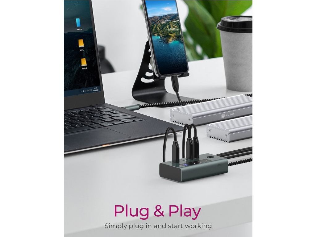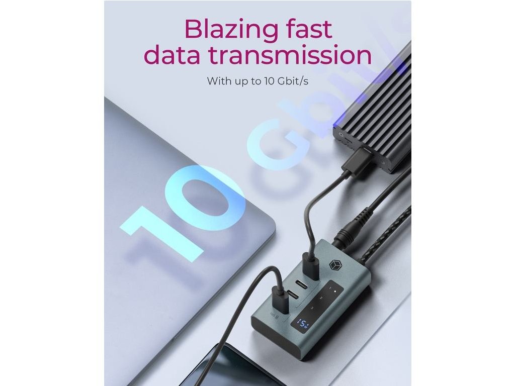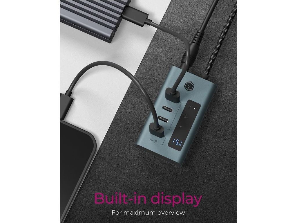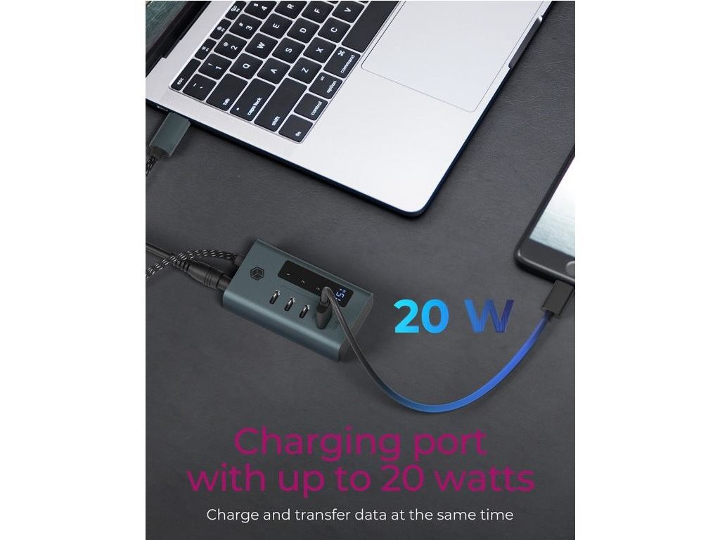Hub rozširuje jeden port USB-C na 4 porty USB Type-C 3.2 Gen2, ktoré používateľovi ponúkajú rýchlosť prenosu dát až 10 Gbit. Jeden z portov navyše ponúka funkciu nabíjania s výkonom až 20 wattov pre pripojené zariadenie. Za spoľahlivé napájanie je zodpovedný priložený 24 wattový zdroj. To znamená, že všetky 4 porty vrátane funkcie nabíjania je možné využívať súčasne.