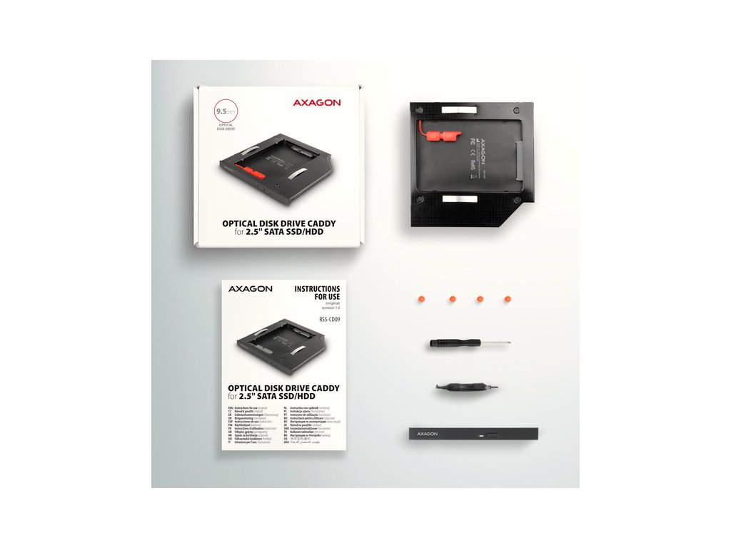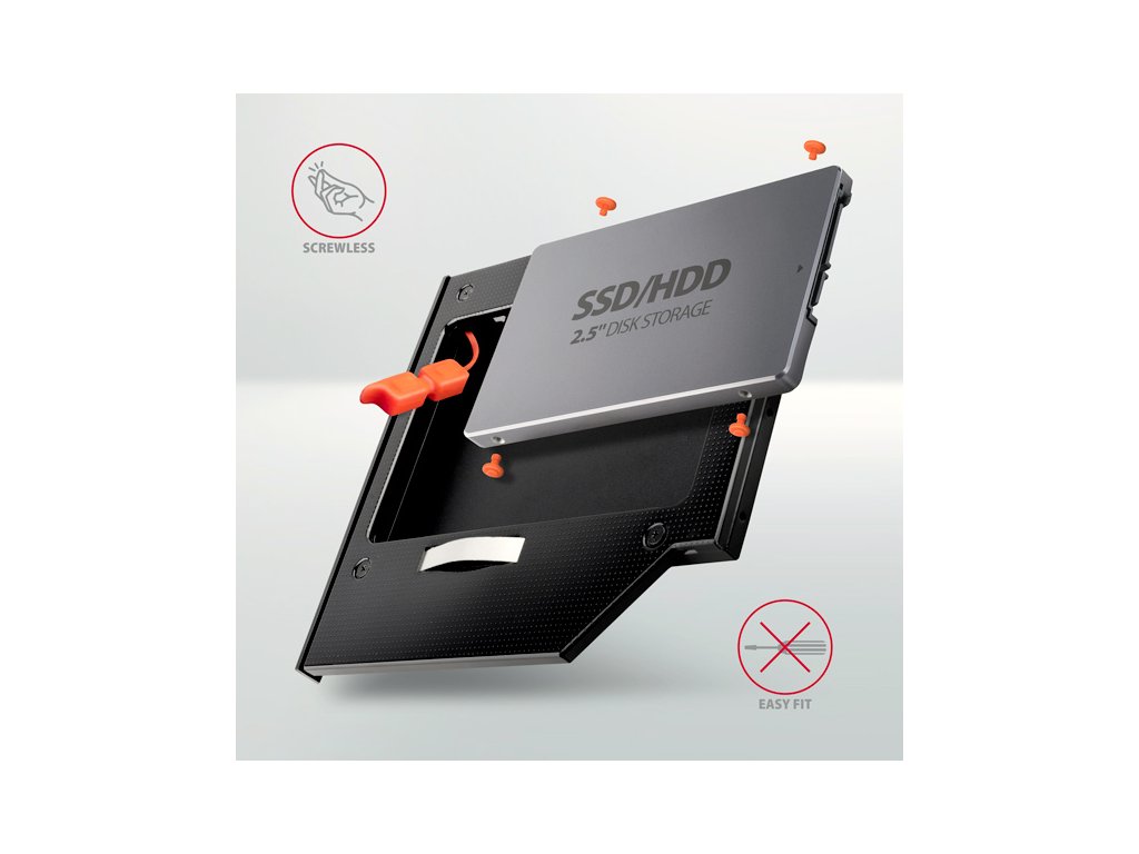 Vnútorný rám AXAGON RSS-CD09 na montáž na miesto existujúcej CD/DVD mechaniky s výškou 9.5 mm. Je určený pre 2.5" disky SSD/HDD SATA. Optickú jednotku v prenosnom počítači môžete ľahko nahradiť pevným diskom.