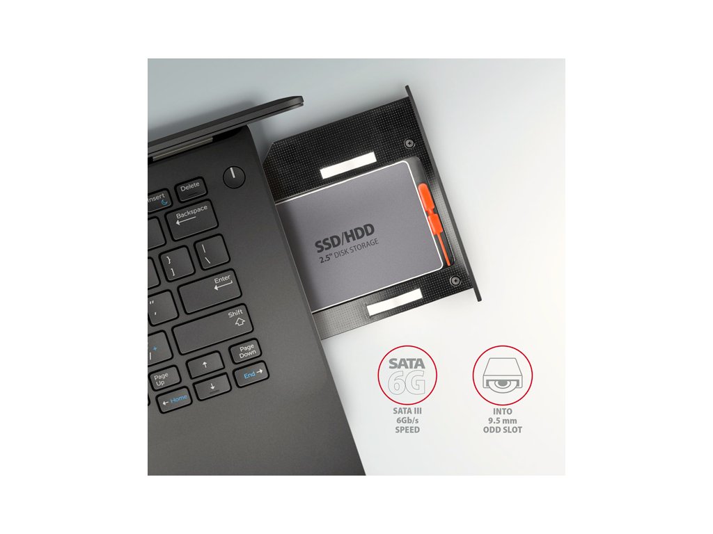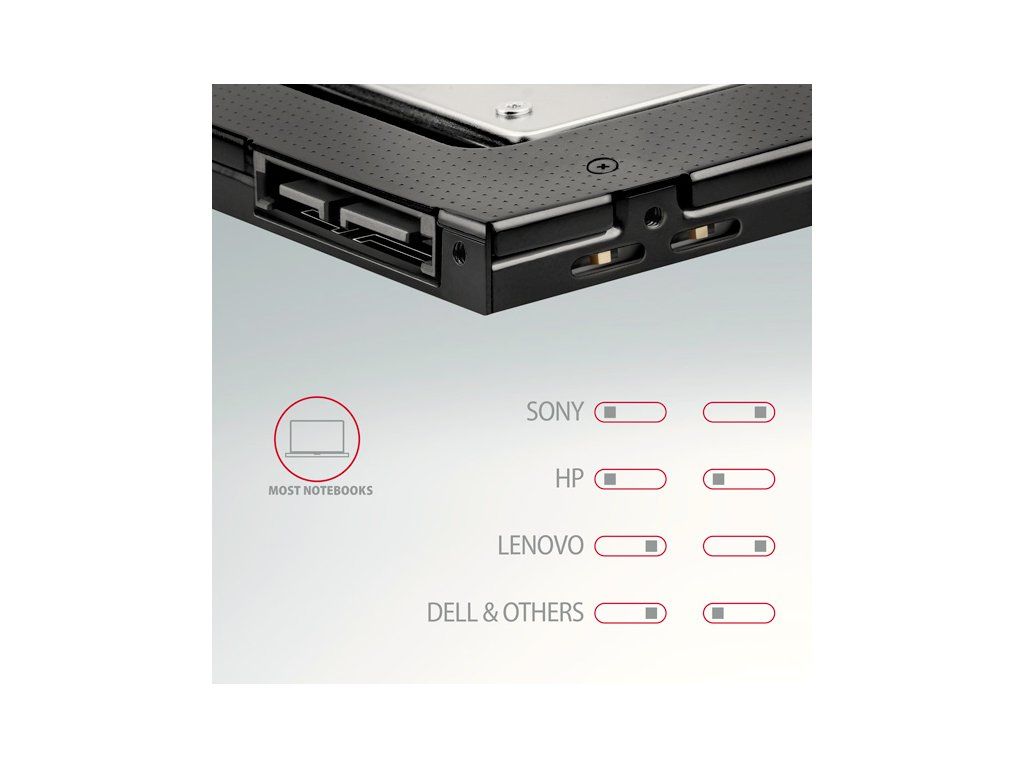 Rozhranie SATA 6G umožňuje využívať rýchlosť moderných diskov SSD až do 6 Gb/s. Vďaka absencii zložitej elektroniky nespomaľuje rýchlosť prenosu dát a podporuje všetky moderné funkcie, napr. TRIM. Táto redukcia zaručuje širokú kompatibilitu s rôznymi značkami notebookov. Rám ODD možno nastaviť pomocou dvojitého prepínača, takže bude fungovať s väčšinou notebookov značiek LENOVO, HP, DELL, ASUS, ACER, SONY, TOSHIBA a ďalších.