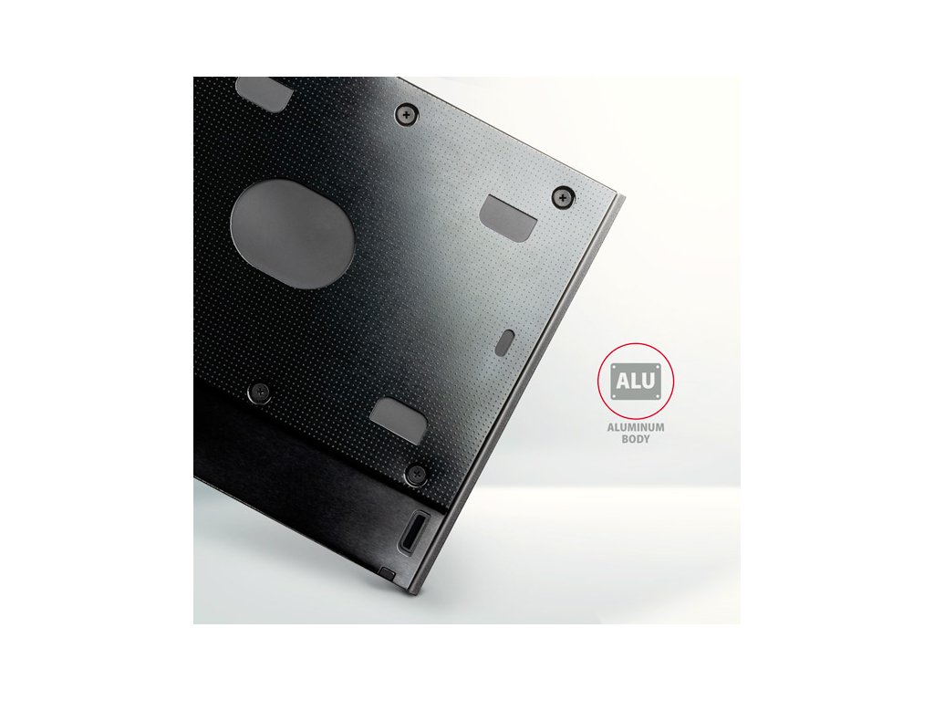 Jedinečný bezskrutkový systém upevnenia diskov sa upevňuje pomocou gumových svoriek alebo gumových závitových vložiek. Gumové vložky tiež pomáhajú minimalizovať vibrácie pevného disku. Kovové pružiny pomáhajú upevniť adaptér v hriadeli optického pohonu. Kovové telo rámu je vyrobené z hliníka a poskytuje dokonalú mechanickú ochranu vloženému disku. Zabudovaný kondenzátor HQ pomáha stabilizovať napájanie SSD/HDD. Vloženie disku a prenos dát signalizuje elegantná zabudovaná LED dióda. Súčasťou balenia je aj plastová predná časť (záslepka), ktorá imituje prednú časť optickej mechaniky CD/DVD. Na zadnej strane redukcie je niekoľko montážnych otvorov na upevnenie rámu v tele notebooku.