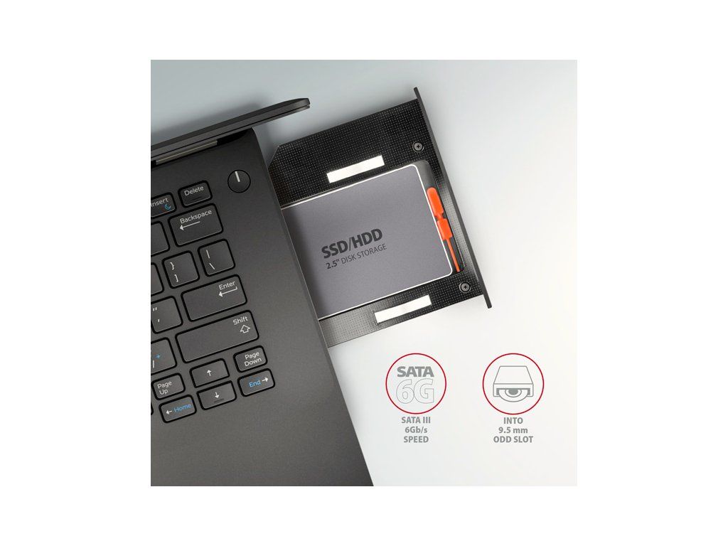 Do rámu je možné umiestniť štandardné 7 mm SSD disky aj 9 mmHDD disky.5 mm o 2.5". Káder ODD s nainštalovaným diskom sa v operačnom systéme a v systéme BIOS (UEFI) správa ako štandardný pevný disk. Vložením jednotky do reduktora sa ľahko pridajú 2 vnútorné.5" disk, ktorý možno použiť na doplnenie existujúceho disku v notebooku. S podporou zavádzania, pridaním 2.5" disk SSD, ktorý výrazne zrýchli starší notebook.
