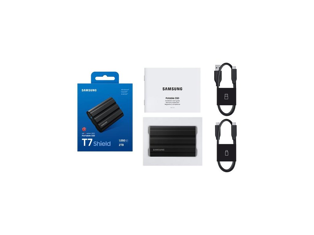Obsah balenia: Samsung Portable SSD T7 Shield, USB 3.2 Gen2, USB kábel C na A, USB 3.2 Gen2, USB kábel C na C, Stručná používateľská príručka a Vyhlásenie o záruke