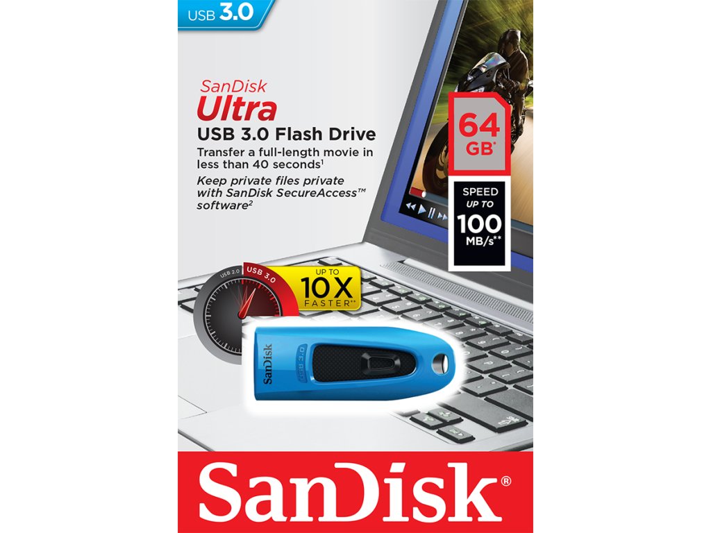 SanDisk Ultra USB 3.0 Flash Drive kombinuje rychlejší přenos dat a velkorysou kapacitu v kompaktním, stylovém balení. - přenos souborů až čtyřikrát rychlejší než USB disky 2.0 - ochrana soukromých souborů s SanDisk SecureAccess™ softwarem - čtení do 100 MB/s - zápis do 40 MB/s - kompatibilita: USB 3.0 a USB 2.0 - operační systém: Windows 2000/ME/XP/Vista/7/8, Linux, MacOS X ver. 10.1.2 nebo vyšší - materiál: kov/plast Připojení: USB 3.0 A vidlice Rychlost datového přenosu: 100 MB/s USB standard: USB 3.0 Materiál: Kov | Plast Ochrana dat pomocí hesla: Ano Zasouvací USB konektor: Ano Kapacita: 64 GB Záruka: 60 měsícůDodatočné parametre