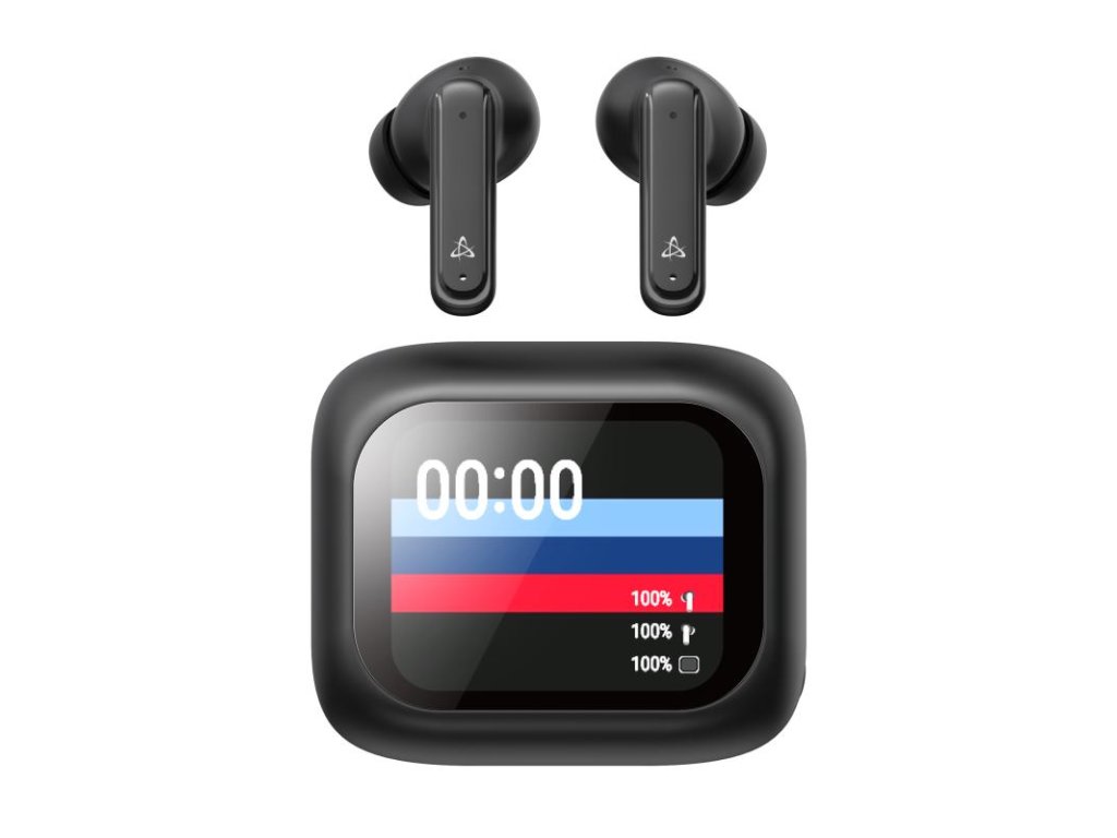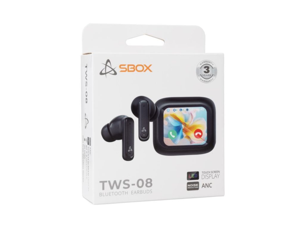 Bluetooth slúchadlá do uší SBOX EB-TWS08-B s aktívnym potlačením hluku (ANC) a dotykovým displejom, frekvenčný rozsah: 20Hz - 20kHz, rozhranie: Bluetooth 5.4 (BR, EDR, BLE), integrovaný mikrofón, prevádzková vzdialenosť: 10 metrov , doba nabíjania: 1-2 h, kapacita batérie: 35mAh, nabíjacia kolíska: 400 mAh, doba prehrávania hudby: viac ako 4h, materiál: plast, USB Type C konektor na nabíjanie kolísky, rozmery (mm): 22x16x30 (slúchadlá) / 27x59x51 (nabíjacie puzdro)