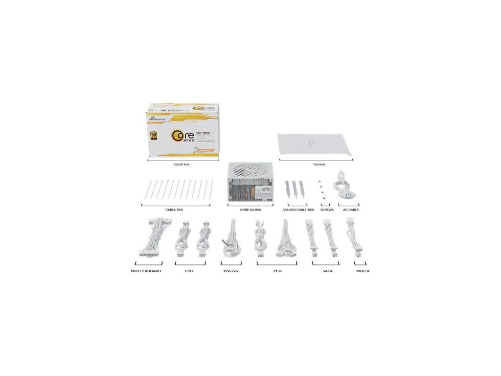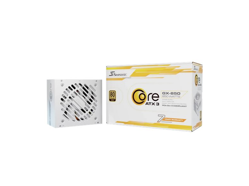 CORE GX White ATX 3.1 The updated Seasonic CORE GX White ATX 3.1 Series complies with the latest ATX 3.1 and PCIe 5.1 standards and includes four output ranges from 1000 W to 650 W in both black and white colors. Catering to a broad spectrum of PC enthusiasts and system builders, these power supplies provide a fine balance between cost and performance. The 80 PLUS® Gold certified Seasonic’s Core GX White line is a fully modular design equipped with white cables featuring a braided pattern. These power supplies are solid performers for a large range of applications, where a 120 mm Hydro Dynamic Bearing fan is combined with Seasonic’s Smart and Silent Fan Control to ensure the optimal cooling performance at the lowest possible noise level. These quality power supplies are backed up by Sea Sonic’s 7-year worldwide manufacturer’s warranty. Specifications 850 W Technical Specifications 80PLUS® Gold Cybenetics Efficiency Level Platinum Cybenetics Noise Level A- Form Factor ATX/EPS Dimensions 140 × 150 × 86 mm Fan Information Fan Size 120 mm Fan Control Smart and Silent Fan Control Fan Bearing Hydro Dynamic Bearing Life Expectancy 25,000 hours at 40 °C, 15 % — 65 % RH Cable Information Modularity Fully Modular Cable type Individual White Cables with Braided Pattern Electrical Features Operating Temperature 0 - 50 °C (derating from 100 % to 80 % from 40 °C to 50 °C linearly) MTBF @ 25 °C, excl. fan 100,000 hours AC Input Full Range Protection OCP, OPP, OTP, OVP, UVP, SCP Safety and Environmental Safety and EMC BSMI, C-tick, CB, CCC, CE, cTUVus, EAC, FCC, TUV, UKCA Environmental Compliance Energy Star, ErP Lot 6, REACH, RoHS, WEEE Warranty 7 Years Power Output AC Input 100 V - 240 V 11 - 5.5 A 50 Hz - 60 Hz DC Output Rail +3.3 V +5 V +12 V -12 V +5 VSB Maximum Power 20 A 20 A 70 A 0.3 A 3 A 100 W 840 W 3.6 W 15 W Total continuous power 850 WDodatočné parametre