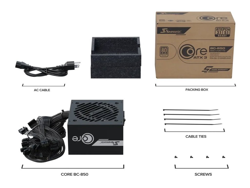 Napájecí zdroj Seasonic Core BC-850 dodá energii a bez kompromisů utáhne výkonné PC sestavy, ať už zaměřené na práci, tvorbu, hry, nebo multimediální zábavu. Díky výkonu 850 W zvládne provozovat i velmi „hladové“ procesory, grafické karty a další komponenty. Zdroj Seasonic Core BC-850 je plně kompatibilní se standardy ATX 3.1 a PCIe 5.1, které si porozumí s nejnovějším hardwarem současnosti.