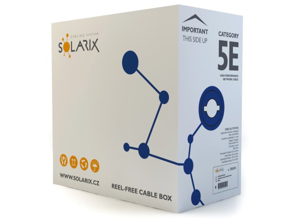 Rovnako ako ostatné káble Solarix, je aj kábel SXKD-5E-FTP-PVC značený metráží po 1m v rozsahu od 0 do 305m. Kábel je dodávaný vo vysoko odolnom trojvrstvovom leštenom kartónovom boxe (vždy farebne jednoznačnom podľa typu kábla), na ktorom sú uvedené všetky nevyhnutné produktové informácie vrátane čiarových kódov, výrobné šarže, popisu a najdôležitejších technických parametrov (napr. NVP v podobe QR kódu).