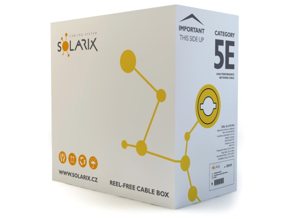 Tento inštalačný kábel s označením SXKD-5E-UTP-PVC je spoľahlivou súčasťou produktového radu Solarix - kategórie 5E. Spoločne s ostatnými komponentmi systému štruktúrovanej kabeláže Solarix vytvára riešenie, ktoré zaručuje dlhú životnosť, maximálny výkon a bezproblémový chod počítačovej siete. Inštalačné káble Solarix - kategórie 5E sú určené pre horizontálne rozvody a sú ponúkané v tienenej aj netienené verzii s rôznym typom plášťa - tj. PVC, LSOH alebo UV stabilný PE. Tieto káble bez problémov spĺňajú požiadavky definované v medzinárodných štandardoch ANSI / TIA / EIA 568, ISO / IEC 11801 a EN 50173 pre kategóriu 5E a sú vhodné aj pre prenos dát rýchlosťou až 1 Gb / s (tj. Gigabitový Ethernet).