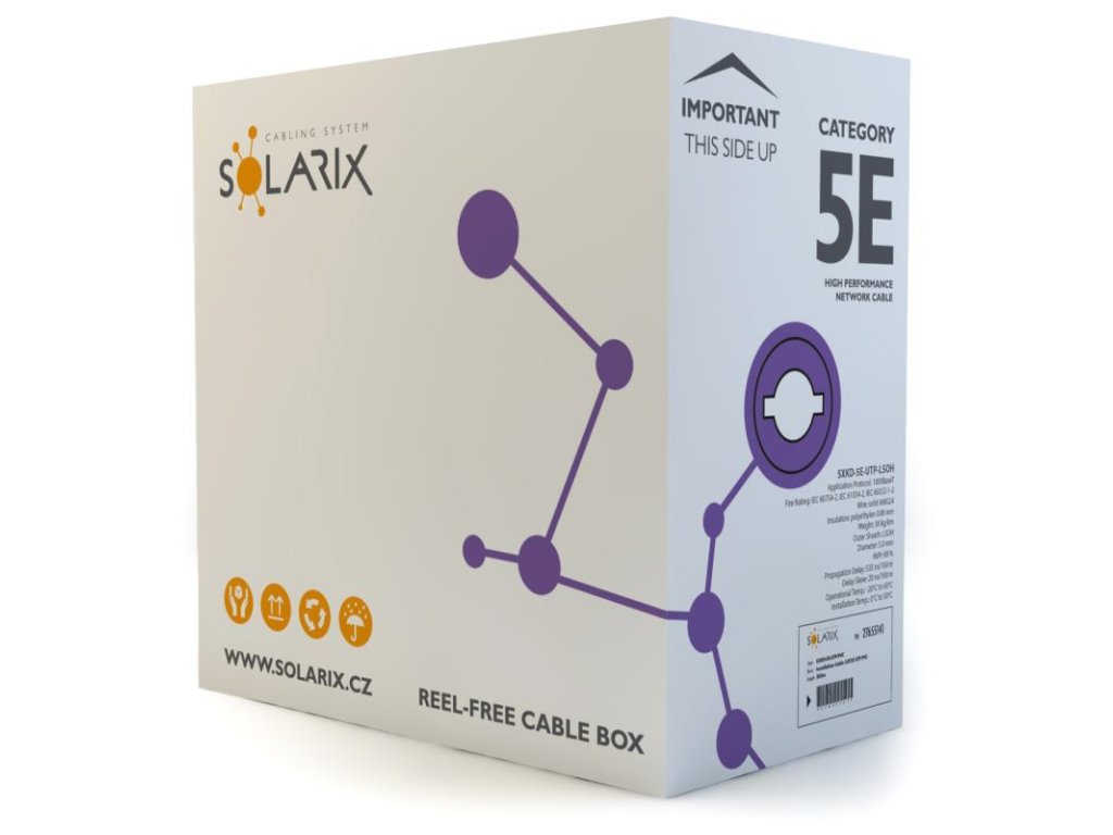 Tento inštalačný kábel s označením SXKD-5E-UTP-LSOH je spoľahlivou súčasťou produktového radu Solarix - CAT5E. Spoločne s ostatnými komponentmi systému štruktúrovanej kabeláže Solarix vytvára riešenie, ktoré zaručuje dlhú životnosť, maximálny výkon a bezproblémový chod počítačovej siete. Inštalačné káble Solarix - kategórie 5E sú určené pre horizontálne rozvody a sú ponúkané v tienenej aj netienené verzii s rôznym typom plášťa - tj. PVC, LSOH alebo UV stabilné PE. Tieto káble bez problémov spĺňajú požiadavky definované v medzinárodných štandardoch ANSI / TIA / EIA 568, ISO / IEC 11801 a EN 50173 pre kategóriu 5E a sú vhodné aj pre prenos dát rýchlosťou až 1 Gb / s (tj. Gigabitový Ethernet).