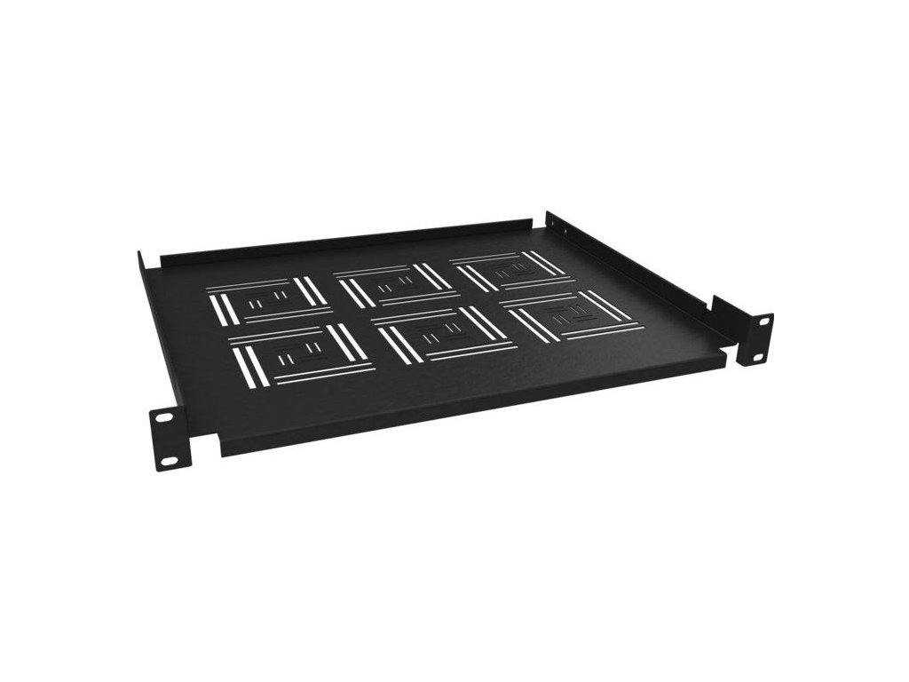 19" perforovaná polica 350mm s dvojbodovým uchytením v predu do dátového rozvádzača, alebo pre uchytenie v 4 bodoch na prednú aj zadnú lištu. Pri doplnení ďalších úchytov je možné police uchytiť až v 6 bodoch. výška 1U, nosnosť 10 kg.