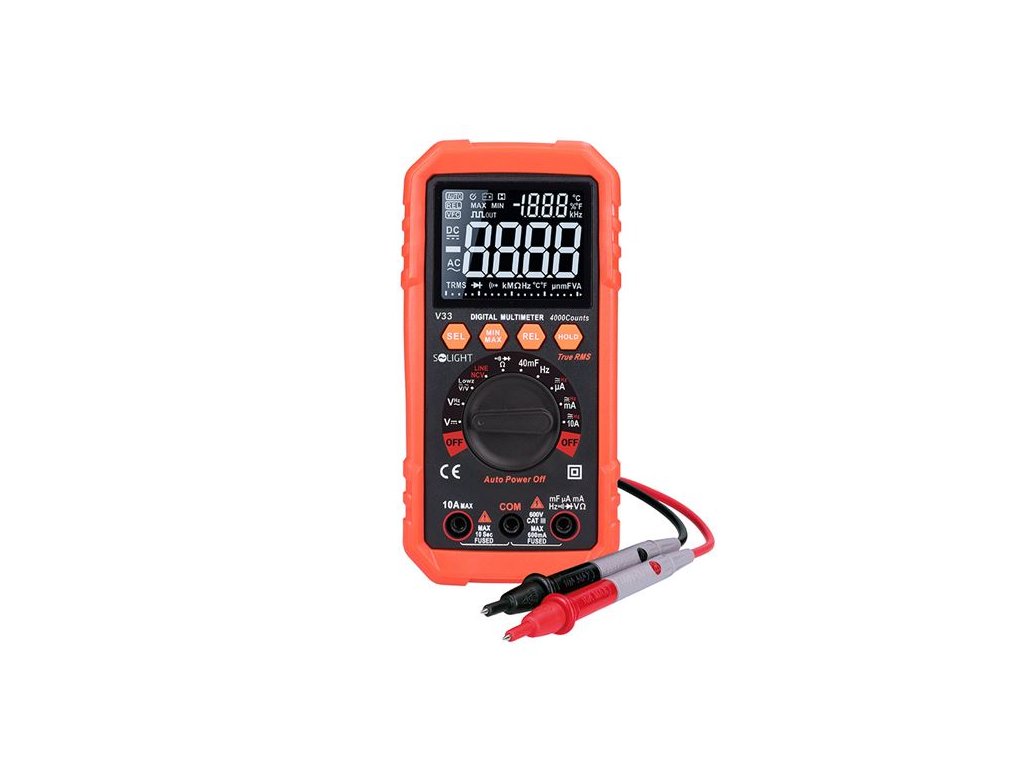 MultimeterMultimeter with backlit EBTN display (51.5 x 40 mm) for easy readability. Measure DC/AC voltage (400mV - 600V), DC/AC current (400µA - 10A), resistance (400? - 40M?), capacitance (40nF - 40mF) and frequency (4Hz - 10MHz). Temperature from 0°C to 50°C and diode test. Features true RMS, Hold, Min/Max, NCV voltage detection (30V - 1000V), circuit continuity with buzzer. Overload protection and CAT III 600V certification. Power supply: 2x AAA batteries, automatic shutdown after 15 minutes. Dimensions: 155 x 71.9 x 45 mm, weight: 300 g.