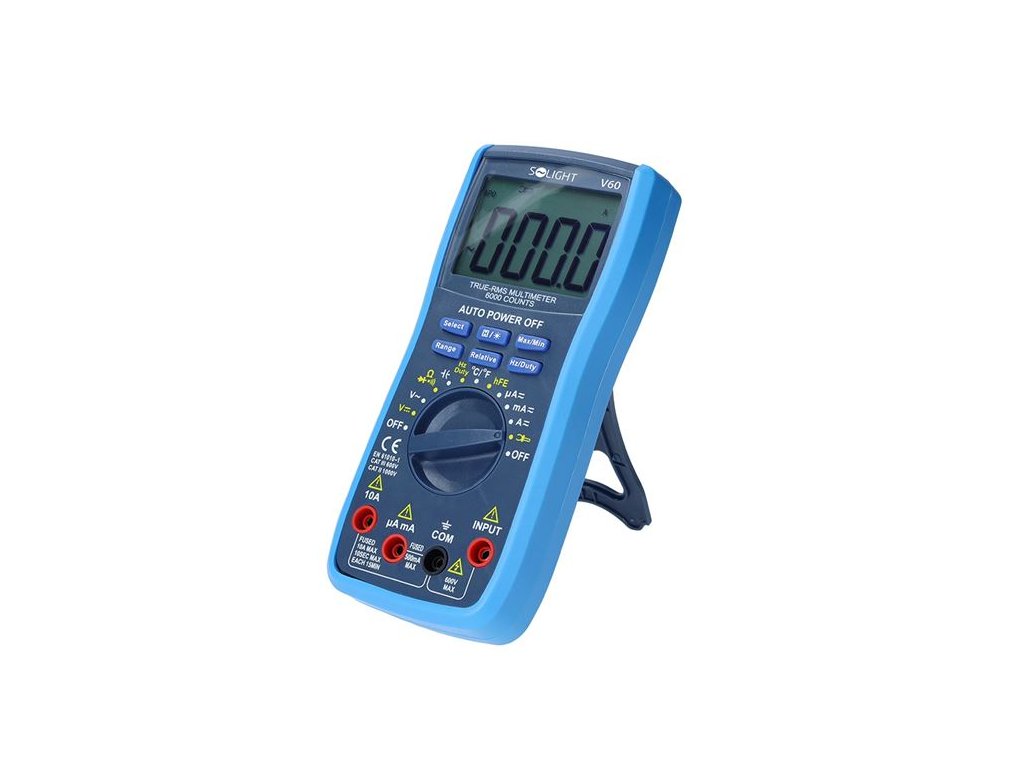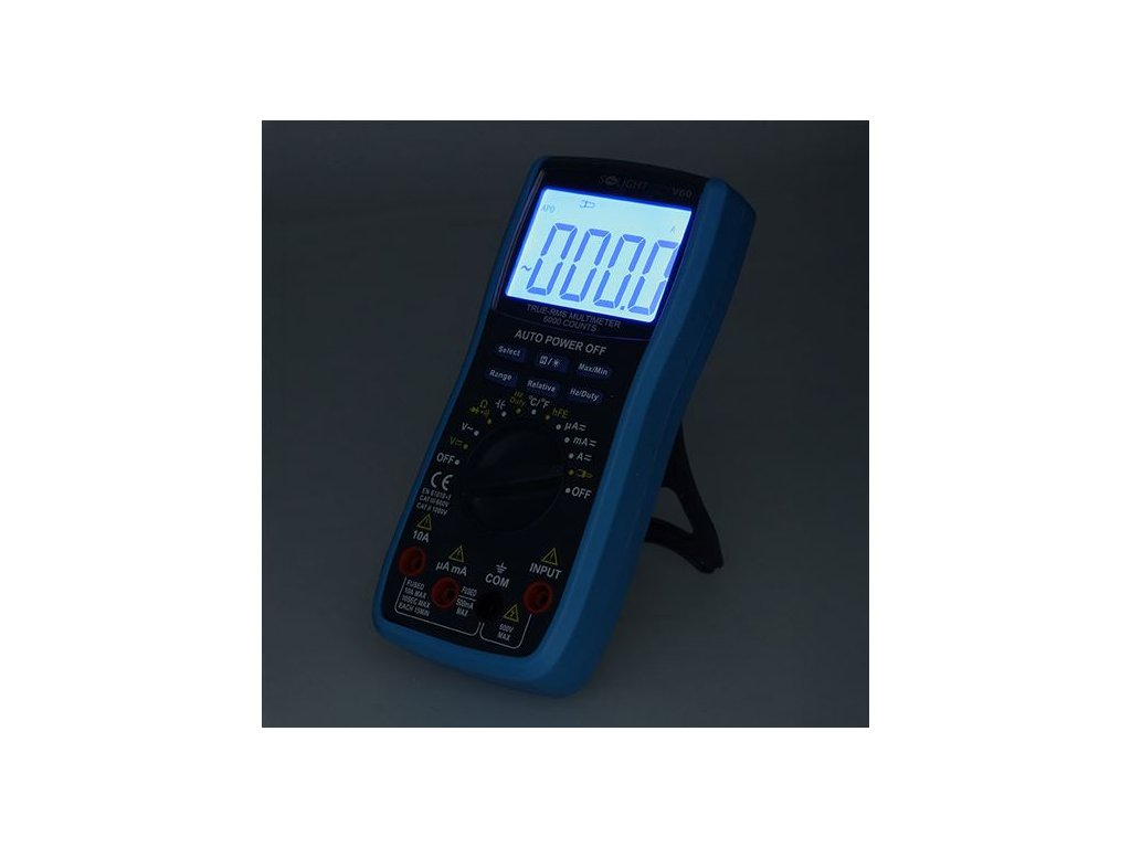 Profesionálny multimeterDigitálny multimeter s podsvieteným displejom LCD (64 × 42 mm) a maximálnym zobrazením 6 000 hodnôt. Ponúka funkciu HOLD na uchovanie hodnoty, relatívne meranie (režim REL) a funkciu MAX/MIN na zaznamenávanie extrémnych hodnôt. Test diód, test hFE tranzistorov, test spojitosti so zvukovým signálom. Automatická detekcia polarity, indikácia nebezpečného napätia. Meranie DC/AC napätia (600mV - 1000V), DC/AC prúdu (600µA - 10A), odporu (600? - 60M?), kapacity (60nF - 60mF), teploty (-40°C - 1000°C), frekvencie (10Hz - 10MHz). Ochrana proti preťaženiu a vysokému napätiu (1000V DC / 750V AC). Napájanie: 9V batéria (6F22). Rozmery: 190 × 90 × 35 mm, hmotnosť: 357 g.
