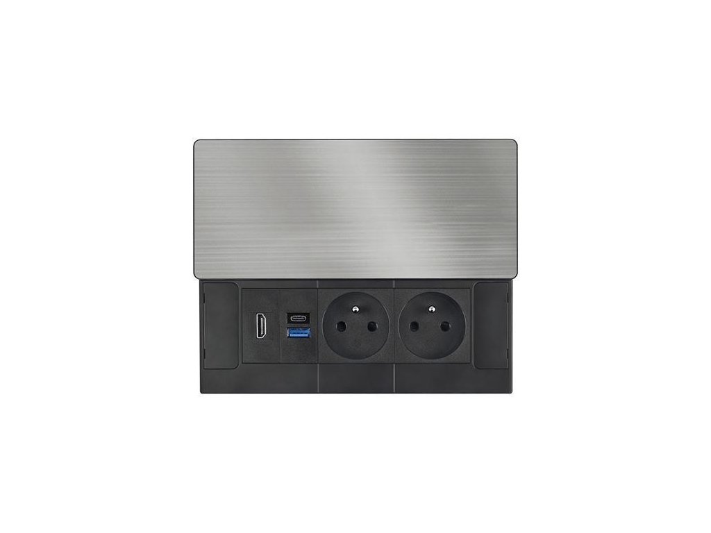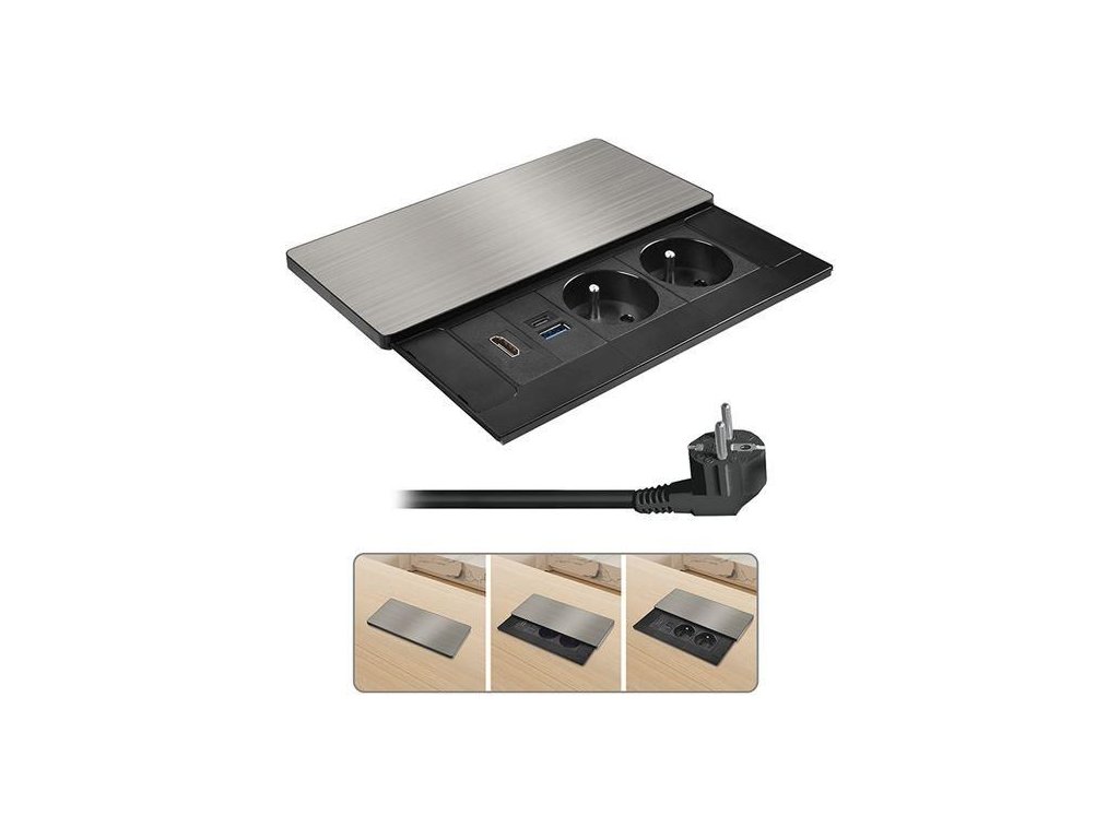 Tento vstavaný blok zásuviek ponúka viac než len napájanie – kombinuje dve sieťové zásuvky 230 V, USB rýchlonabíjačku a HDMI port v jednom kompaktnom module. Vrchný kryt z matnej tmavej nehrdzavejúcej ocele (inox) s posuvným mechanizmom sa ľahko začlení do moderného interiéru pracovných stolov, prezentačných priestorov aj obývacích izieb. Vďaka káblu dlhému 2 metre je inštalácia flexibilná a pohodlná.
