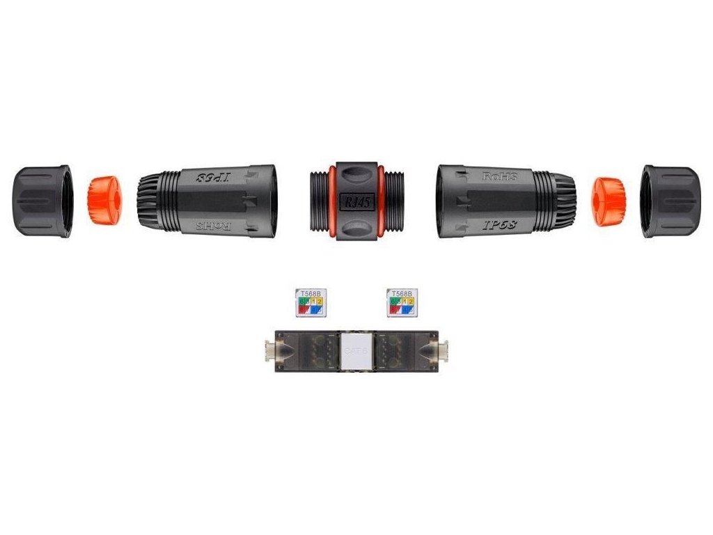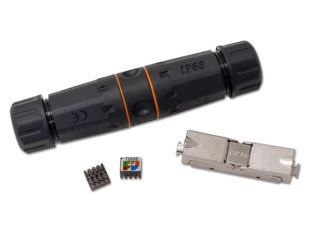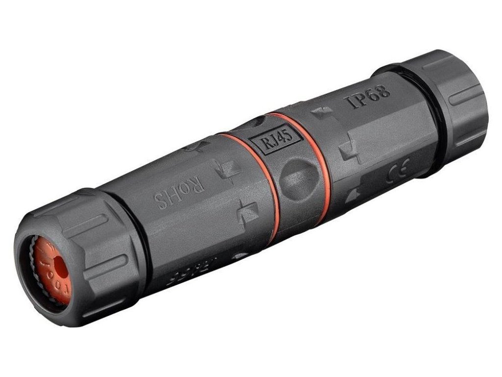 Tienená vodotesná spojka pre rozvod Cat5e/6/6a. Určené na predĺženie segmentov koncovo pripojených káblov. Vhodný nástroj pre vonkajšiu inštaláciu aktívnych vonkajších prvkov a ich jednoduchú montáž a demontáž na ťažko dostupných miestach.
