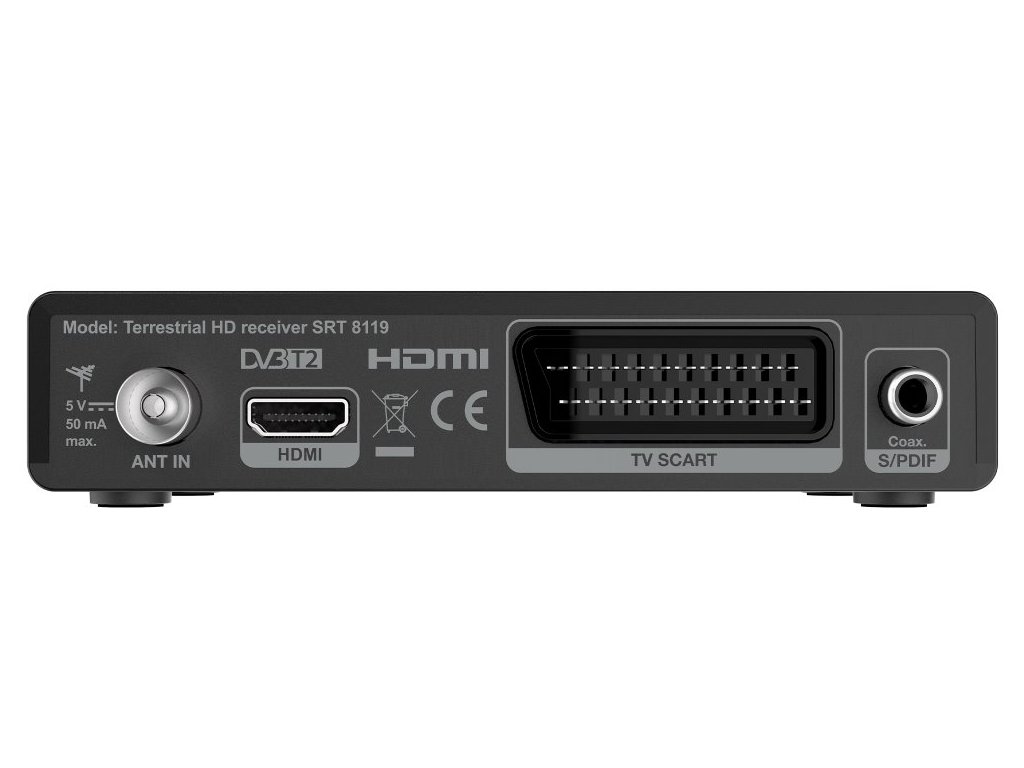 Set-top-box Strong SRT 8119 pro příjem pozemního vysílání DVB-T2. Toto kompaktní zařízení je vybaveno technologií HEVC pro zobrazení podporovaných HD kanálů ve vysoké kvalitě. Tento kompaktní HDTV přijímač Strong SRT slouží pro příjem digitálních volně šiřitelného vysílání televizních a rozhlasových stanic skrze vnitřní nebo venkovní antény. Vylepšený tuner podporuje vynikající příjem a stabilitu signálu. Přítomný USB port slouží k nahrávání vašich oblíbených TV pořadů, respektive následné přehrávání uložených souborů. Tento model je opatřen jednoduchým displejem.