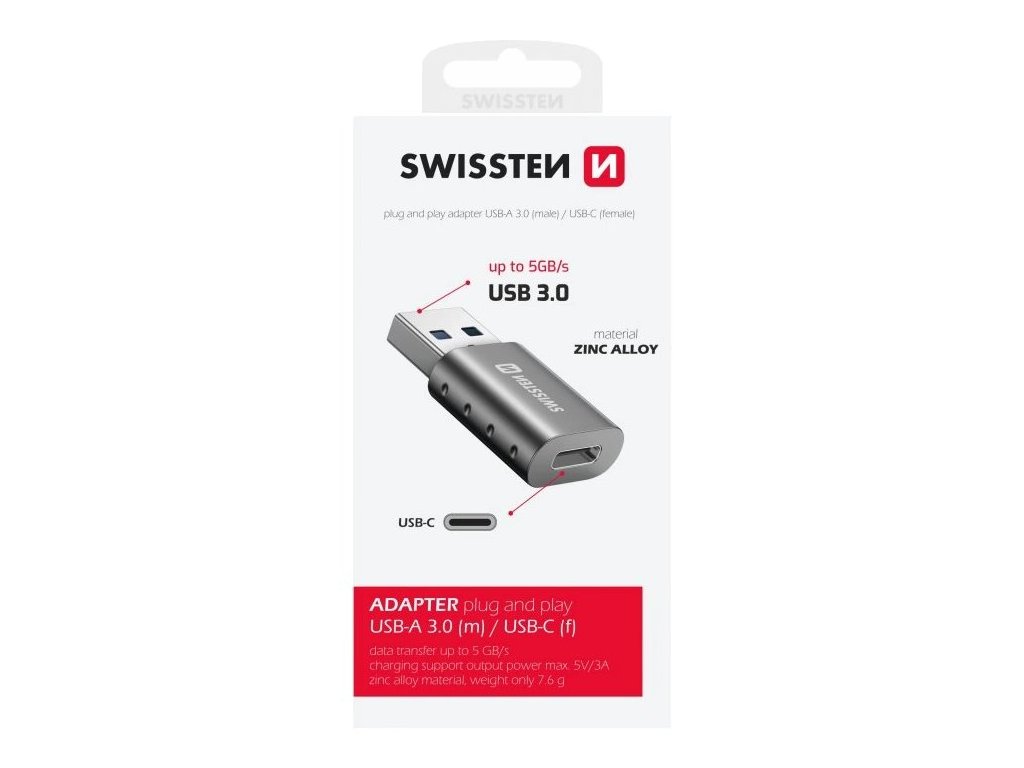 SWISSTEN OTG adaptér USB-C na USB 3.0Miniaturní OTG adaptér umožňuje připojit zařízení s konektorem USB-C do USB 3.0. Podporuje datové přenosy až do rychlosti 5 Gb/s. V případě nabíjení podporuje nabíjecí proud až 3 A a napětí až 5 V. Kryt adaptéru je vyroben z odolného materiálu na bázi zinku.