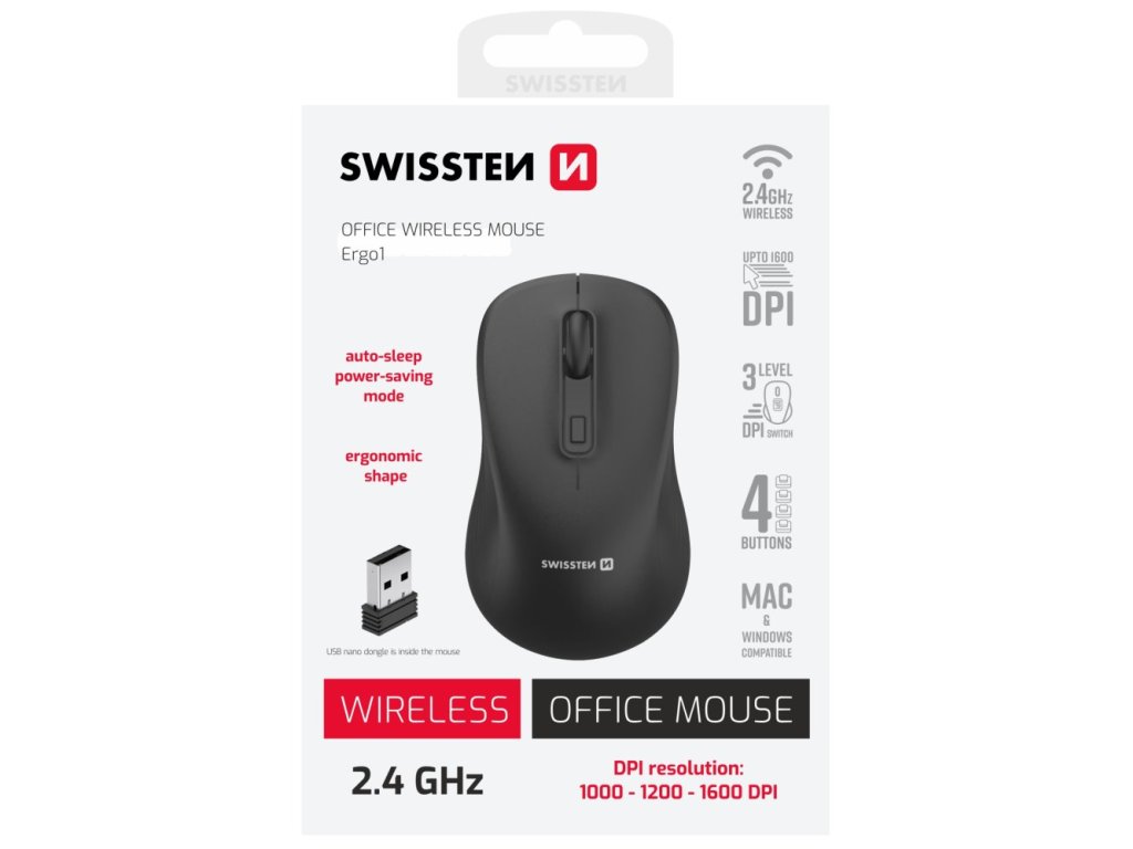 Bezdrátová myš SWISSTEN pro kancelářskou činnost, jako je práce s aplikacemi, úprava tabulek, dokumentů nebo prohlížení internetových stránek. Disponuje optickým senzorem, který dosahuje rozlišení až 1600 DPI. Citlivost je navíc nastavitelná, takže se přizpůsobí vašim požadavkům a optimálně reaguje na rozmanité druhy PC činností. Ergonomický design podporuje komfortní uchopení a pohodlí během celé pracovní směny. Správné uchopení současně snižuje námahu ruky. Kancelářská myš SWISSTEN podporuje bezdrátové připojení skrze USB přijímač s technologií 2,4 GHz. Díky tomu se připojí k PC nebo notebooku rychle a jednoduše bez omezujícího kabelu.