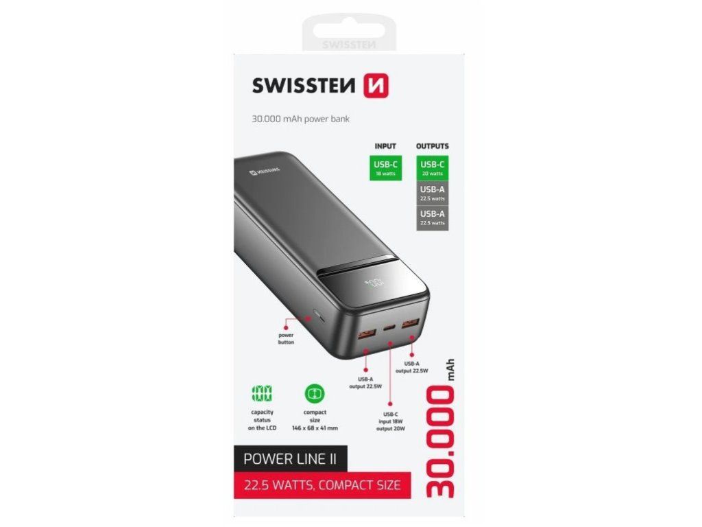 Powerbanka SWISSTEN POWER LINE II 30 000 mAh je spolehlivý zdroj energie pro vaše zařízení na cestách. Kompaktní a lehké provedení umožní snadné přenášení v tašce, batohu nebo v ruce. V rámci domova můžete nabíjet své zařízení třeba z postele, abyste pak nemuseli vstávat. Hlavní uplatnění však najde u milovníků cestování, dobrodružství a přírody. Vždy, když vyrazíte do kempu, na výlet do lesa nebo na víkendový festival, plně nabitá baterie se vždy hodí. Powerbanka SWISSTEN POWER LINE II disponuje kapacitou 30 000 mAh, která je dostatečná pro nabití smartphonu, tabletu nebo drobné nositelné elektroniky – fitness náramku, sluchátek, chytrých hodinek apod.