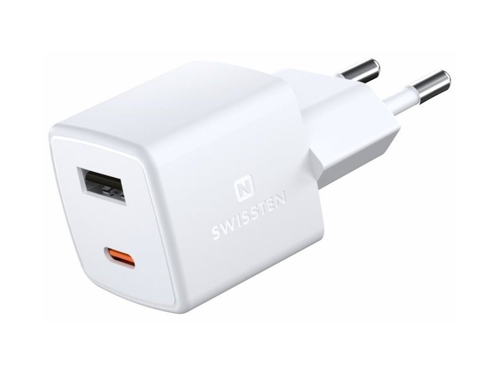 Swissten Síťový Adaptér GaN 1x USB-C + 1xUSB 30W PD mini 3x3x3 cm Bilý 22056100
