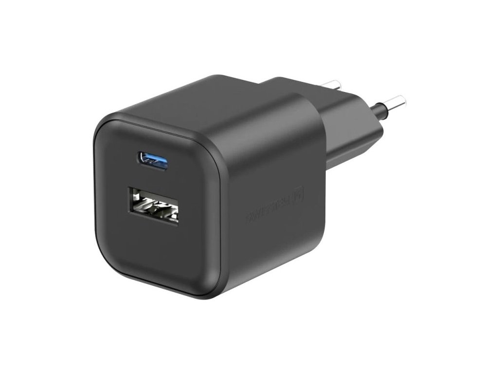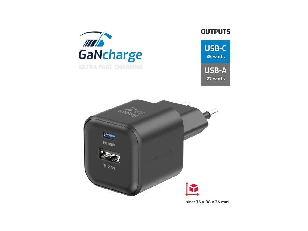 SWISSTEN GaN 1× USB-C PD 35 W + 1× USB QC 27 WUniverzální napájecí adaptér nabízející jeden konektor USB-C s výkonem až 35 W a jeden konektor USB s výkonem až 27 W. Adaptér podporuje protokoly rychlého nabíjení Power Delivery a Quick Charge 4.0. Použitá GaN technologie snižuje tvorbu tepla, čímž zvyšuje účinnost nabíječky při zachování kompaktních rozměrů (přibližně 3,6 × 3,6 × 3,6 cm). Samozřejmostí je ochrana proti zkratování, přepětí, přetížení nabíjení a vysoké teplotě.