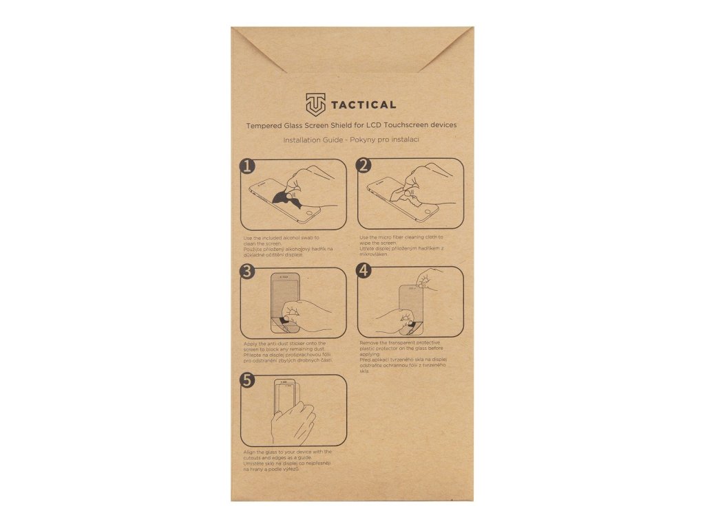 Popis produktu: Prémiové sklo Tactical Glass Shield 5D pro nejlepší ochranu displeje. Sklo chrání i zahnuté okraje displeje a lepí po celé své ploše. Díky tomu je přilnutí k displeji telefonu perfektní a bez bublin. Tloušťka skla je pouhých 0,33mm, na displeji je tak prakticky nerozeznatelné, ale dostatečně pevné, aby ochránilo displej telefonu při nechtěném pádu. Sklo je navíc pokryto z výroby oleofobní úpravou, která zabraňuje ulpívání otisků prstů, velmi snadno se čistí a spolehlivě odpuzuje vodu. Po instalaci skla nedochází ke zhoršení dotykových vlastností displeje ani ke zkreslení barevného podání displeje. Součástí balení je alkoholový ubrousek pro vyčistění a odmaštění displeje, hadřík z mikrovlákna pro perfektní vyleštění před instalací a i následně při používání telefonu s již nalepeným sklem. NEODOLATELNĚ ODOLNÝ U nás v Tactical dbáme na to, aby věci něco vydržely a za kvalitou svých výrobků si stojíme! Proto jsme v rámci nadstandartní péče Tactical schopni na tento produkt nabídnout DOŽIVOTNÍ ZÁRUKU. BE ECO My v Tactical máme rádi přírodu. Všechny naše produkty jsou balené do ECO krabiček z recyklovaného papíru tak, aby co nejméně zatěžovaly životní prostředí. Myslete takticky! Vlastnosti: - zahnuté okraje skla kryjí celý displej - sklo lepí po celé ploše - vyrobené na míru konkrétního modelu telefonu - vysoká odolnost proti poškrábání - tloušťka skla pouze 0,33mm - oleofobní úprava zabraňující zanechávání otisků prstů a pro snadné čištění - perfektní optické vlastnosti - nezkresluje obraz - neovlivňuje citlivost displeje na dotyk - vše potřebné k instalaci v balení - zakryje škrábance na displeji, telefon je pak zase jako nový - ekologické balení z recyklovaného papíru - doživotní záruka Obsah balení - tvrzené sklo Tactical - alkoholový ubrousek pro dokonalé vyčištění displeje - hadřík z mikrovlákna - samolepky pro pohodlnou instalaci skla Rozdíly Tactical 5D vs Tactical 2.5D 5D je prémiové ochranné sklo, které je tvarované tak, aby pokrylo maximum plochy displeje. Lepí po celé ploše a zabraňuje tak vzniku bublin a vnikání nečistot pod sklo. 2.5D sklo je vlastnostmi stejné jako 5D ovšem s tím rozdílem, že je rovné, nekryje zahnuté části displeje a končí obvykle v místě, kde displej přestává být perfektně plochý Návod na nalepení skla Displej co nejpečlivěji očistěte přiloženým hadříkem namočeným v alkoholu. Po zaschnutí povrch displeje vyleštěte přiloženým hadříkem z mikrovlákna. Než přiložíte sklo na displej, ujistěte se, že na displeji nezůstaly žádné, byť sebemenší nečistoty, které by bránily dokonalému přilnutí skla. Věnujte pozornost i místům okolo sluchátka, kde se často drží prach a nečistoty, které by sklo znehodnotily. Sklo opatrně přiložte nad displej, tak aby se překrývaly přesně výřezy pro kameru, sluchátko nebo senzor přiblížení a aby sklo bylo na výšku i šířku perfektně vycentrované. Poté sklo přitiskněte na displej a od středu vytlačte vzduch do krajů. *Obrázek je pouze ilustrační a zobrazuje stejné ochranné sklo pro jiný model telefonu. Výřezy na fotoaparát/reproduktory jsou dle daného telefonu.Dodatočné parametre