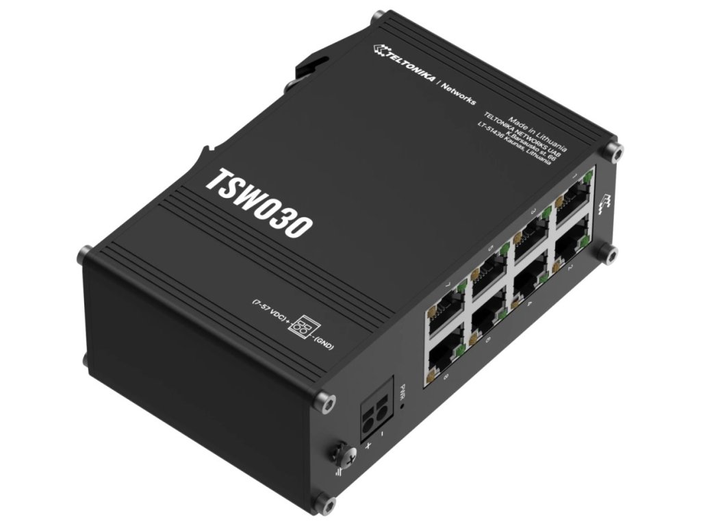 Teltonika TSW030Průmyslový switch bez managementu nabízející osm RJ-45 portů (10/100 Mbps). Snadné použití bez nutnosti konfigurace a instalace. Switch má vestavěný držák na DIN lištu.