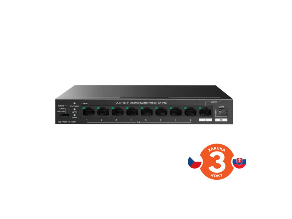 Tenda TEG1110PF-8-120W PoE+ AT switch 8xPoE 802.3af/at + Uplink RJ45 + SFP port, 110W, PoE+, fanless 75012025