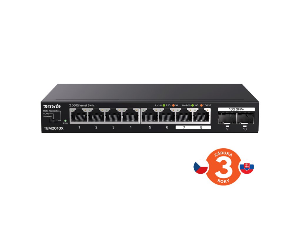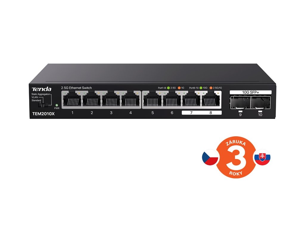 Tenda TEM2010X je 8mi portový 2.5G Ethernet switch a 2x 10G SFP+ porty. 8x RJ45 port 100/1000/2500 Mb/s + 2x SFP+ port 1000/2500/10 000 Mb/s. Propustnost 80 Gb/s, ochrana proti přepětí 6 kV, tabulka pro MAC adresy 16K. Přepínání VLAN, Agregation, Standart. Kovový obal. Součástí balení je český, slovenský a polský manuál. Technické parametry Standarty&protokoly: IEEE802.3, IEEE802.3u, IEEE802.3ab, IEEE802.3x, IEEE802.3bz, IEEE802.3ae, IEEE802.3z Porty: 8x 100/1000/2500 Mbps porty RJ45 auto-negace Porty SFP+: 2x SFP+ 1000/2500/10 000 Mb/s Celková propustnost: 80 Gbps Velikost tabulky MAC adresace: 16K Mód přepínání: Store-And-Forward LED Indikace: 8x Aktivita portu, 8x Linka portu, 2x 1G/2,5 pro SFP, 2x 10G pro SFP, 1x Napájení Napájení: vstup 100 až 240 V, AC 50/60 Hz pro napájecí adaptér Paketová propustnost: 59,5 Mpps Spotřeba: max. 12 W Rozměry: 177 mm x 104 mm x 26 mm(L*W*H) Ochrana proti přepětí: 6 000 V Umístění: na stěnu, desktop Uchycení do Racku: ne Pracovní teplota: 0oC ~ 45oC Vlhkost: 10%-90%RH (nekondenzující) Certifikace: FCC/CE/RoHS Popis produktu Tenda TEM2010X přepíná data pomocí 8mi portů RJ45 a 2x optického SFP+ slotu. 8 RJ45 portů 100/1000/2500 Mb/s a 2x SFP+ slot s rychlostí 100/1000/10 000 Mb/s. Switch má ochranu proti přepětí 6kV. Podpora přepojování uzlů v módu Store-and-Forward. Switch podporuje tři módy: Standart / VLAN / Aggregation. Tenda TEM2010X je vhodná jak do menších a středních firem, tak i do větších domácností. Přepínač Standart / VLAN / Static Aggregation mode Tenda TEM2010X obsahuje přepínač pro výběr ze tří režimů: Standart / VLAN / Static Aggregation mode. Standart mode: V tomto módu pracuje jako klasický switch, veškeré porty mají auto-negaci, všechny porty spolu komunikují. VLAN mode: V tomto módu jsou Port1 až Port6 izolovány samy od sebe, každý port Port1 až Port6 může komunikovat jen s porty Port7 až Port10. Static Aggregation mode (NAS Dedicated mode): Group1 jsou porty Port7 a Port8. Group 2 jsou porty Port9 a Port10. Určeno pro např. dvouportové NAS. Obsah balení 1x Tenda TEM2010X 1x Stručná instalační příručka (CZ, SK, PL, EN) 1x Napájecí adaptérDodatočné parametre