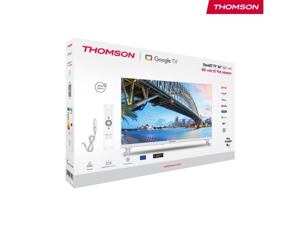 Zažite inteligentnú zábavu pre celú rodinu s Thomson Google TV 24" HD White 12V. Vychutnajte si svoje obľúbené filmy na vašej ďalšej dovolenke v kempingu. Naše kempingové televízory sú vybavené 12-voltovým adaptérom do auta a vďaka jeho WiFi konektivite máte prístup ku všetkému inteligentnému obsahu pomocou smartfónu ako hotspotu. Vezmite si zábavu so sebou na cesty, či už ste v kempingovom aute, kamióne, dodávke alebo dokonca na lodi. Google TV zjednodušuje váš zážitok zo zábavy organizovaním obsahu z vašich aplikácií a odberov. Vytvorte si viacero používateľských profilov a profitujte z vybraných odporúčaní. Vychutnajte si širokú škálu inteligentných funkcií, ako je prístup k viac ako 400 000 filmom a televíznym reláciám, inteligentné hlasové ovládanie pomocou Google Assistant a Google Cast na streamovanie obsahu z kompatibilných inteligentných zariadení do vášho televízora. Vďaka elegantnému bezrámovému dizajnu sa môžete plne sústrediť na dianie na obrazovke. Technológia Dolby Audio vytvára dynamický zvukový zážitok. Vstavaný trojitý tuner umožňuje príjem cez satelitnú anténu, terestriálnu anténu alebo kábel. Takže môžete prijímať všetky dostupné kanály bez ďalšieho hardvéru. Ergonomický diaľkový ovládač s plynulým podsvietením vám umožní mať všetko na očiach aj pri slabom osvetlení. Rýchly prístup k vašej obľúbenej aplikácii pomocou tlačidla FAVORITE. Integrovaný Google Assistant vám umožňuje intuitívne ovládať televízor pomocou hlasových príkazov. Vyhľadajte svoje obľúbené filmy, požiadajte o odporúčania na základe vašej nálady alebo ovládajte kompatibilné inteligentné zariadenia – to všetko s pohodlím vášho hlasu.Dodatočné parametre